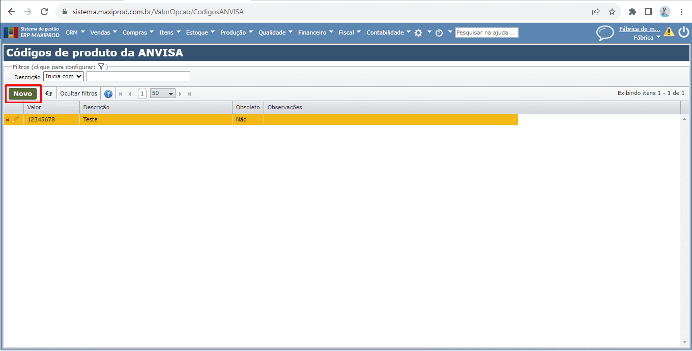 1) Acesse o menu “Itens > Cadastros > Códigos de produto da ANVISA”.