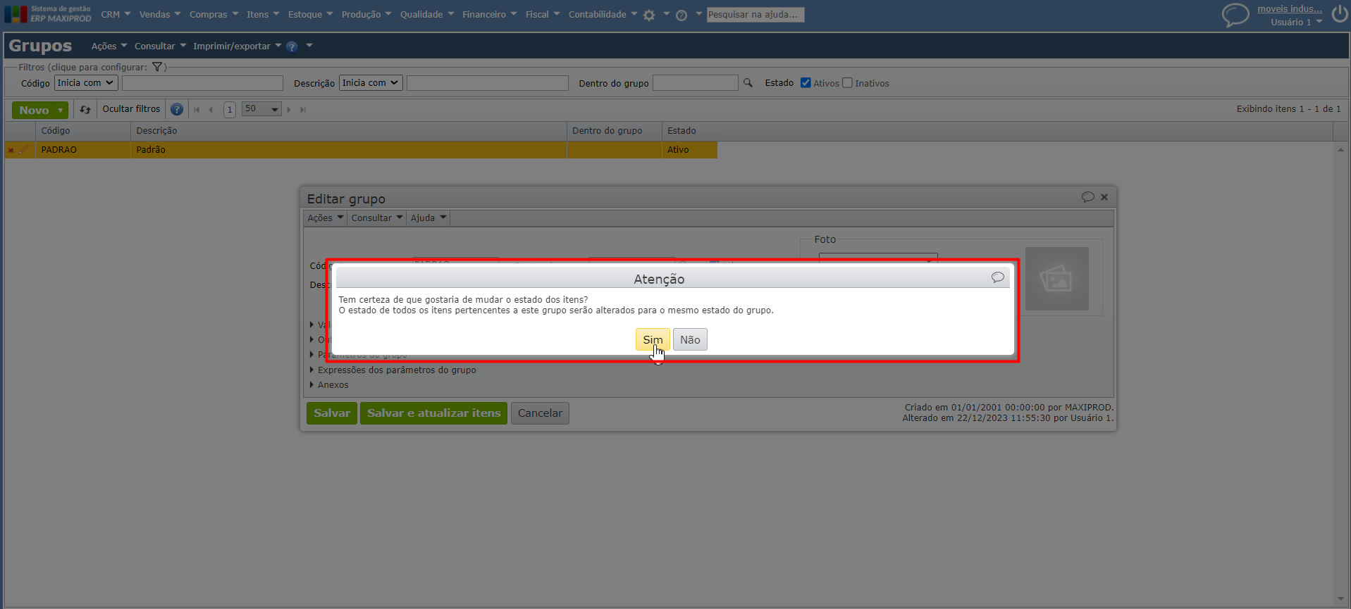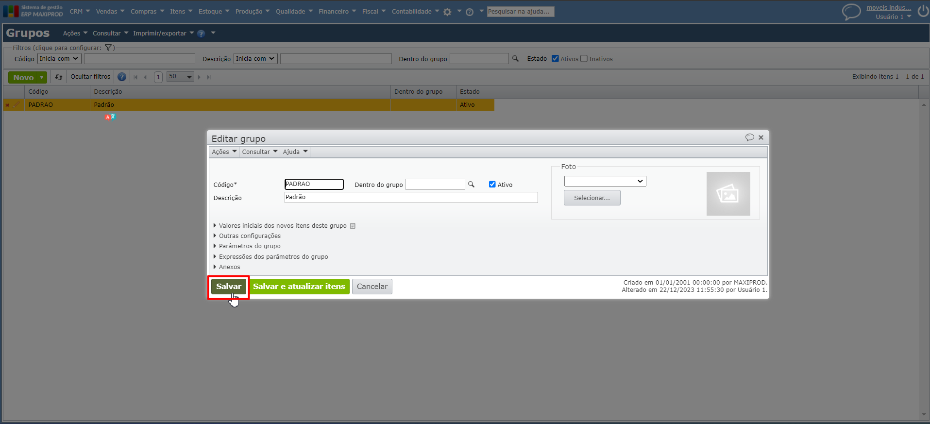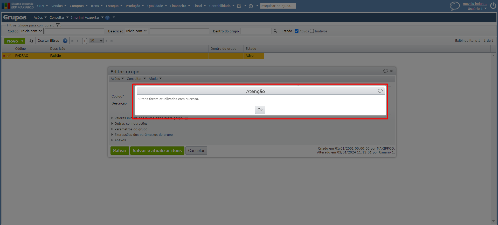Ao acionar este botão, as configurações são aplicadas tanto ao grupo em questão quanto aos novos itens cadastrados e inseridos neste grupo. Esse botão não atualizará os itens já cadastrados e inseridos no grupo, valendo apenas para novos itens.