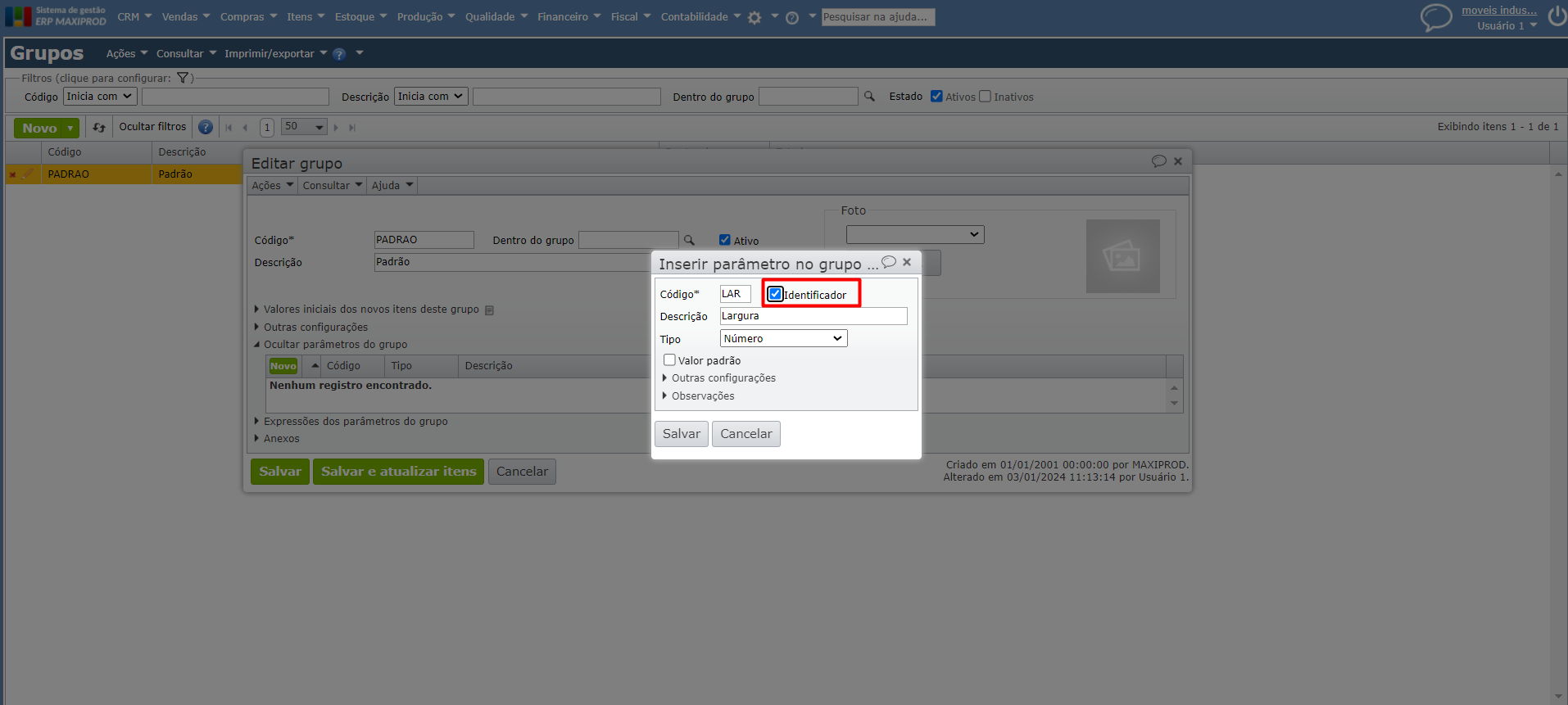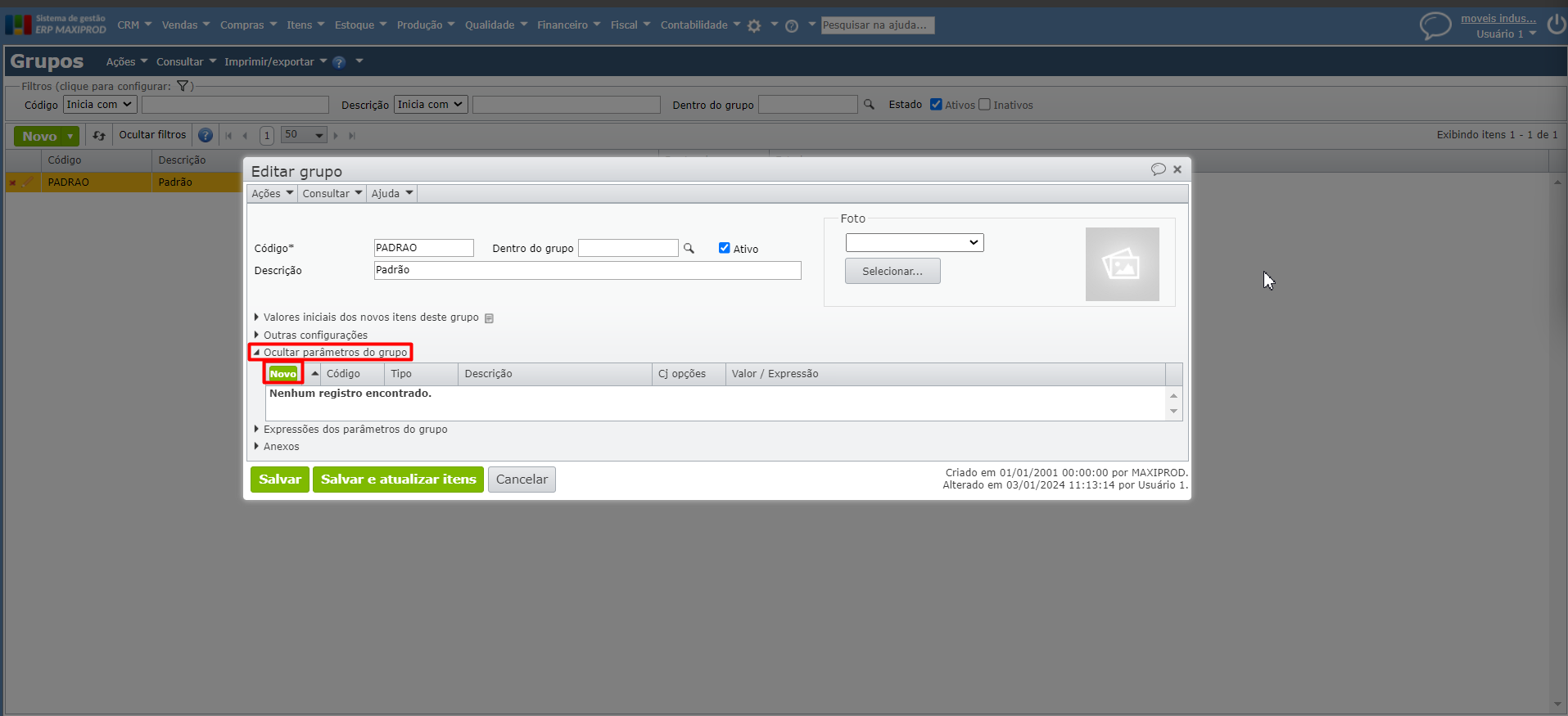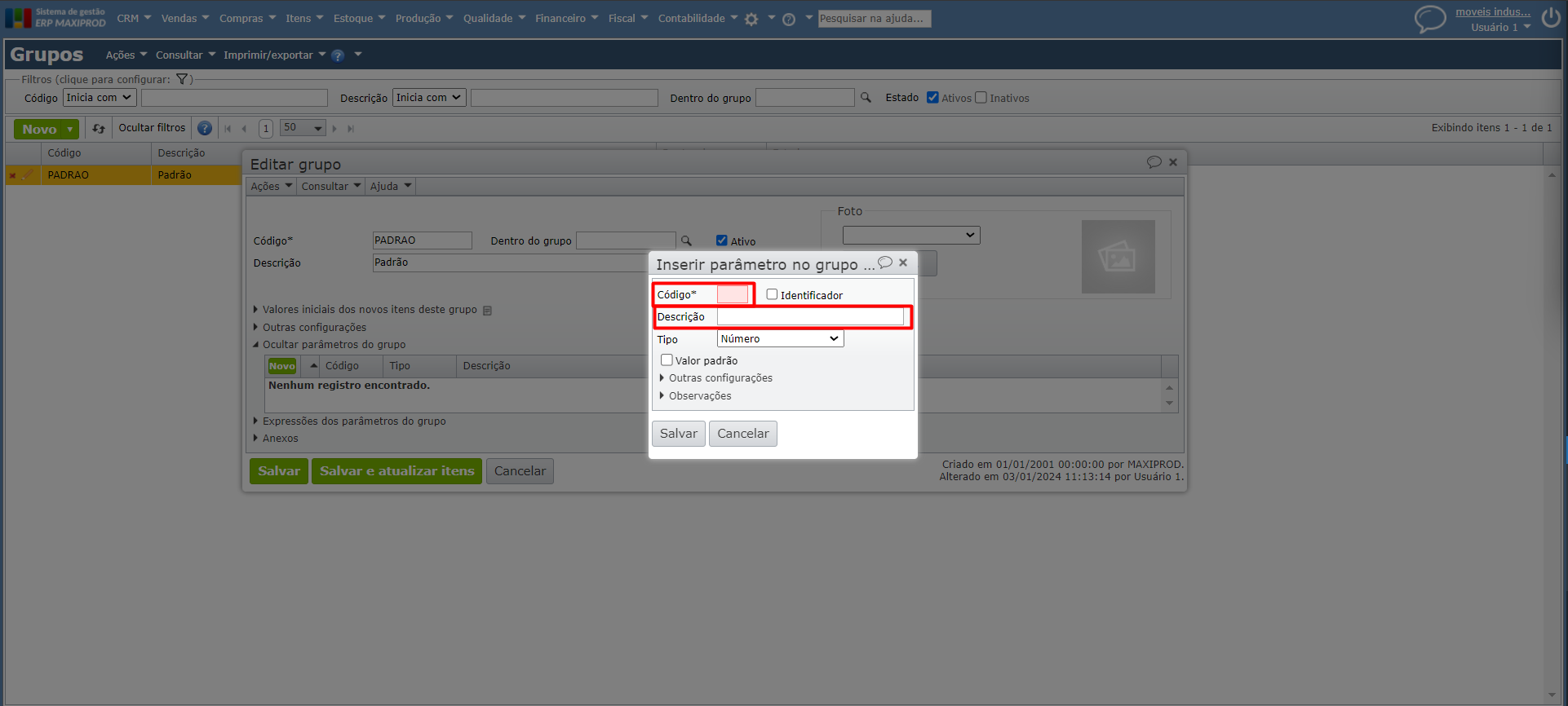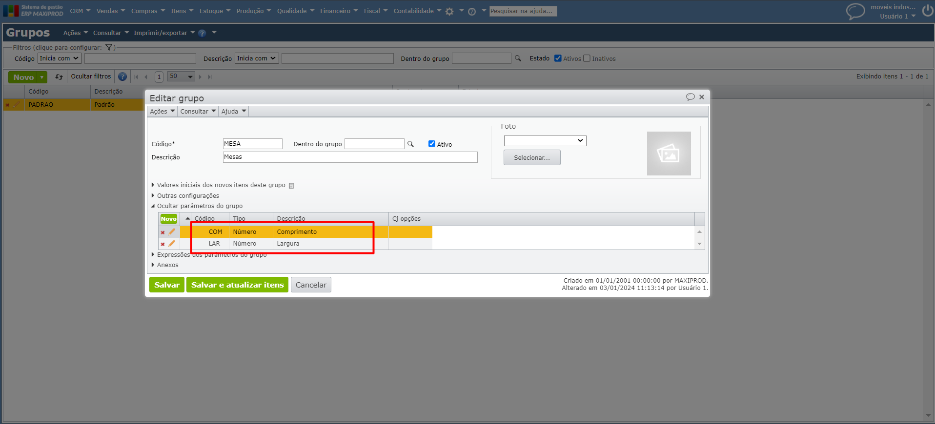 Os grupos são usados para segmentar e organizar o cadastro de itens, agrupando-os em conjuntos de itens com características semelhantes. Os parâmetros facilitam a pesquisa de itens em um grupo, evitando duplicações, compra, estoque e produção desnecessários.