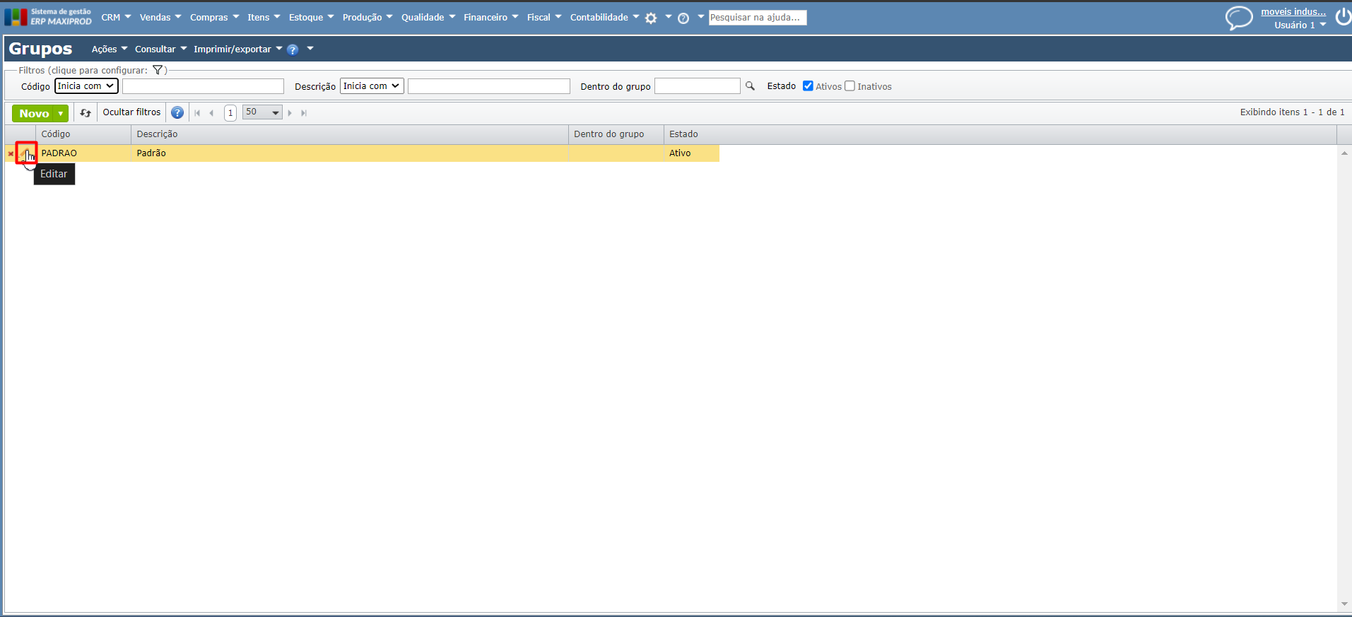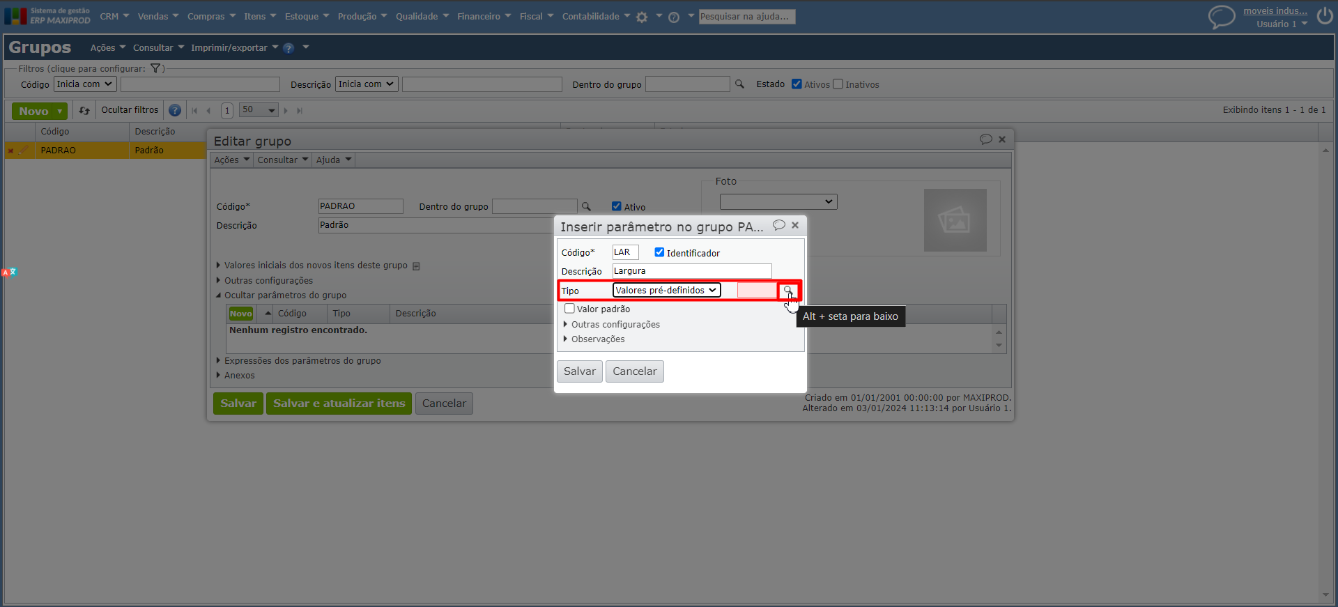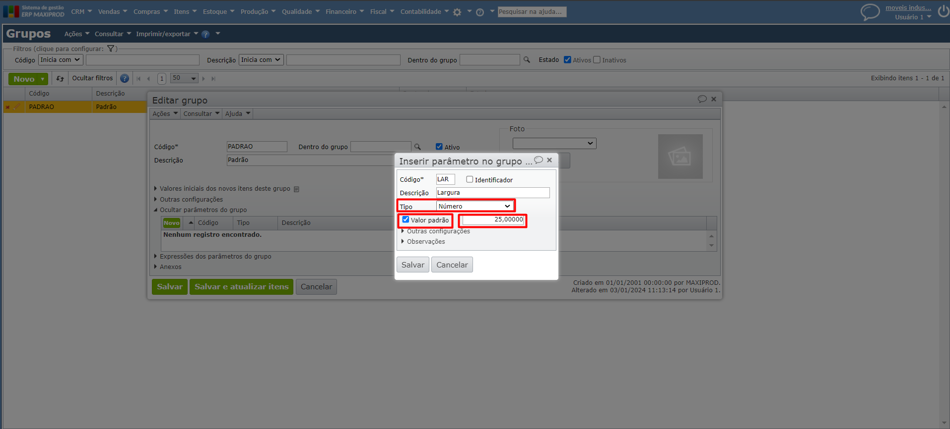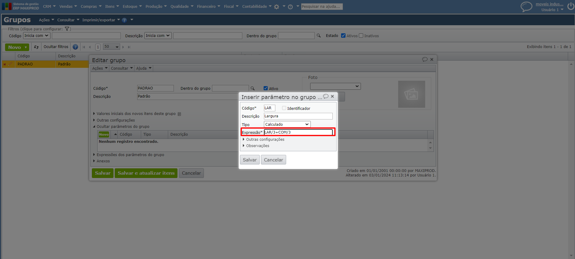 Os grupos são usados para segmentar e organizar o cadastro de itens, agrupando-os em conjuntos de itens com características semelhantes. Os parâmetros facilitam a pesquisa de itens em um grupo, evitando duplicações, compra, estoque e produção desnecessários.