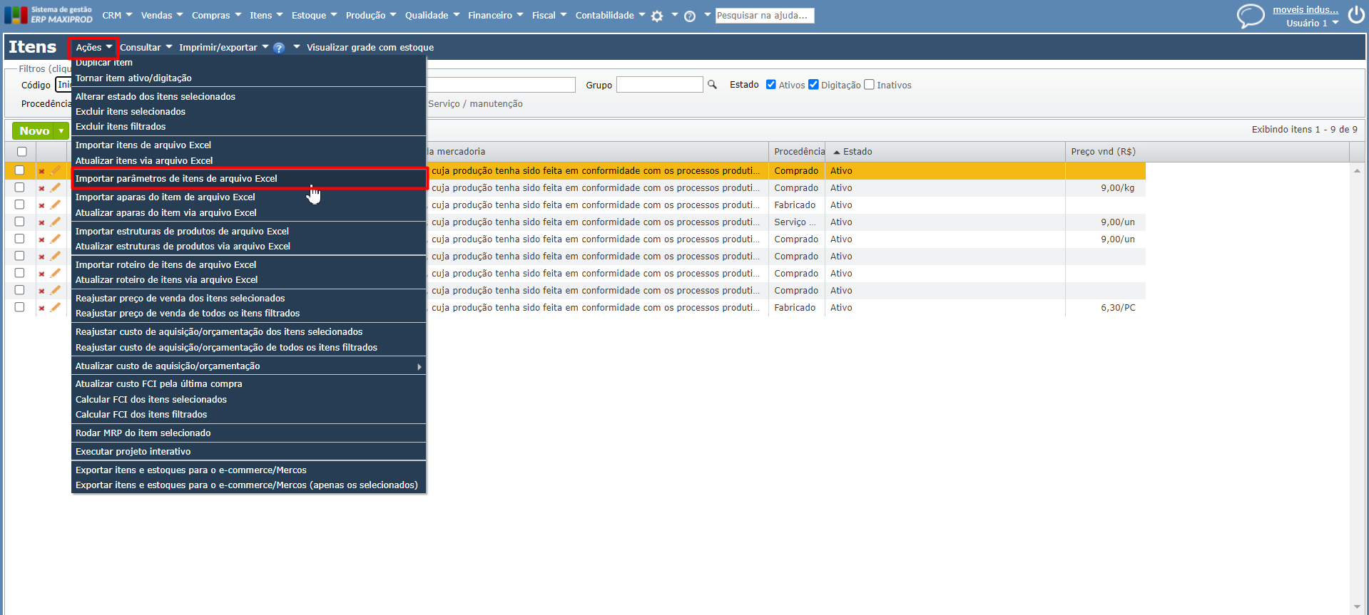 2) A seguir, acesse o menu “Ações > Importar parâmetros de itens de arquivo Excel”.