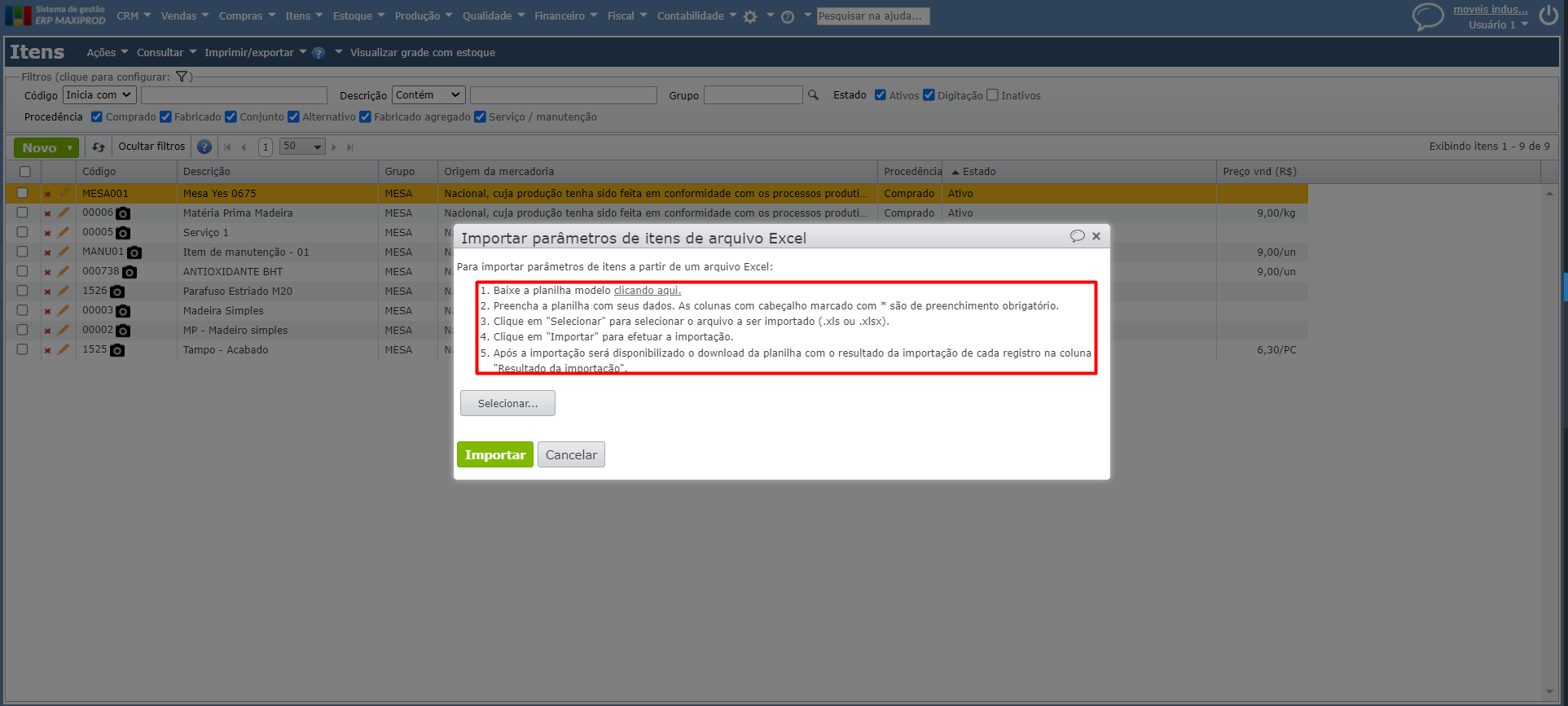 Para incluir em massa valores de parâmetros dos itens por importação de arquivo Excel: