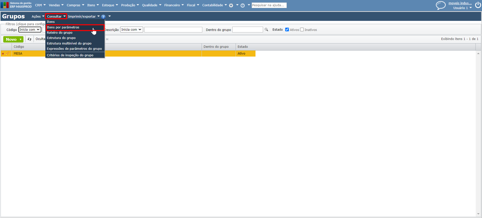 2) Na tela, clique sobre o grupo cujos itens deseja encontrar e clique no menu “Consultar > Itens por parâmetros”.