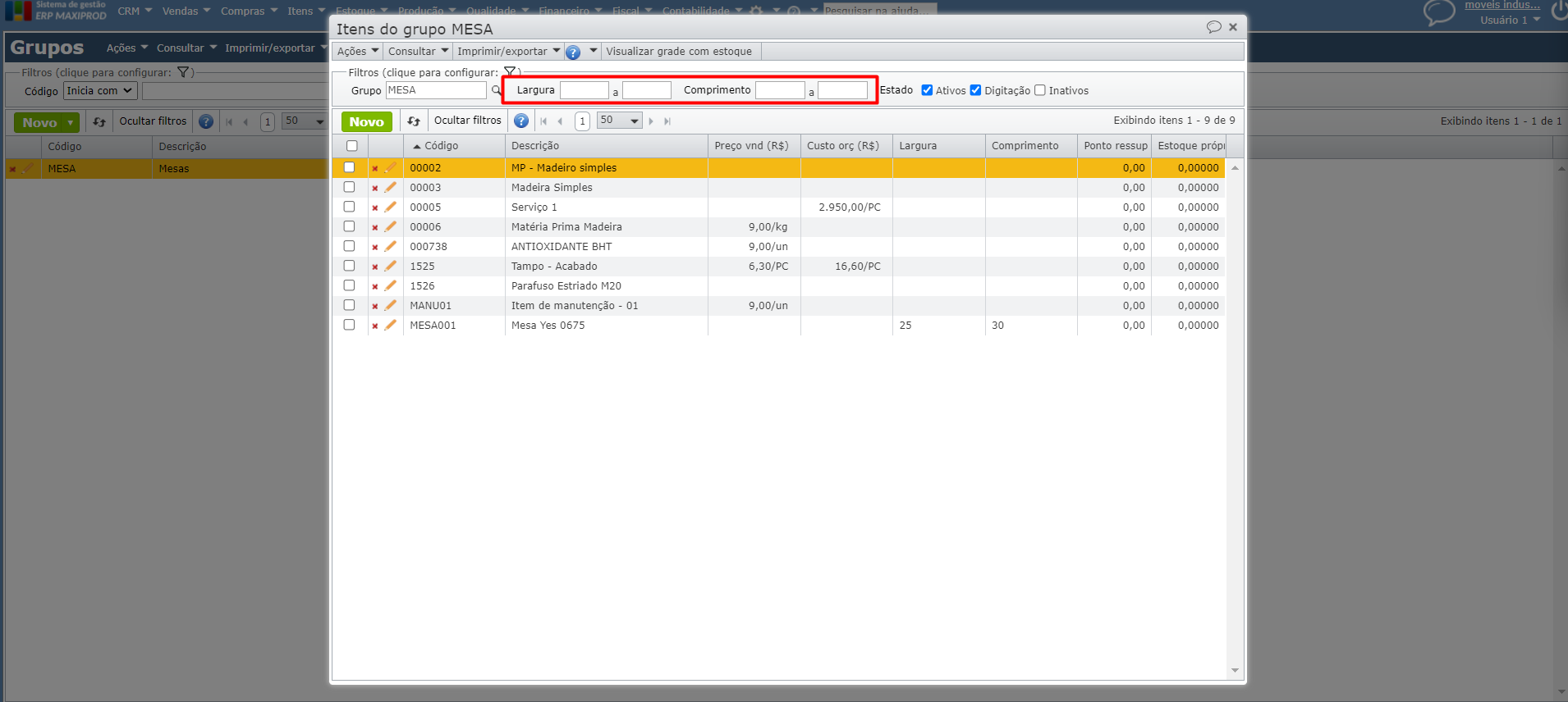 3) É aberta uma tela tendo como filtros os parâmetros do grupo. Preencha-os com os valores desejados, e a grade exibirá os itens correspondentes.