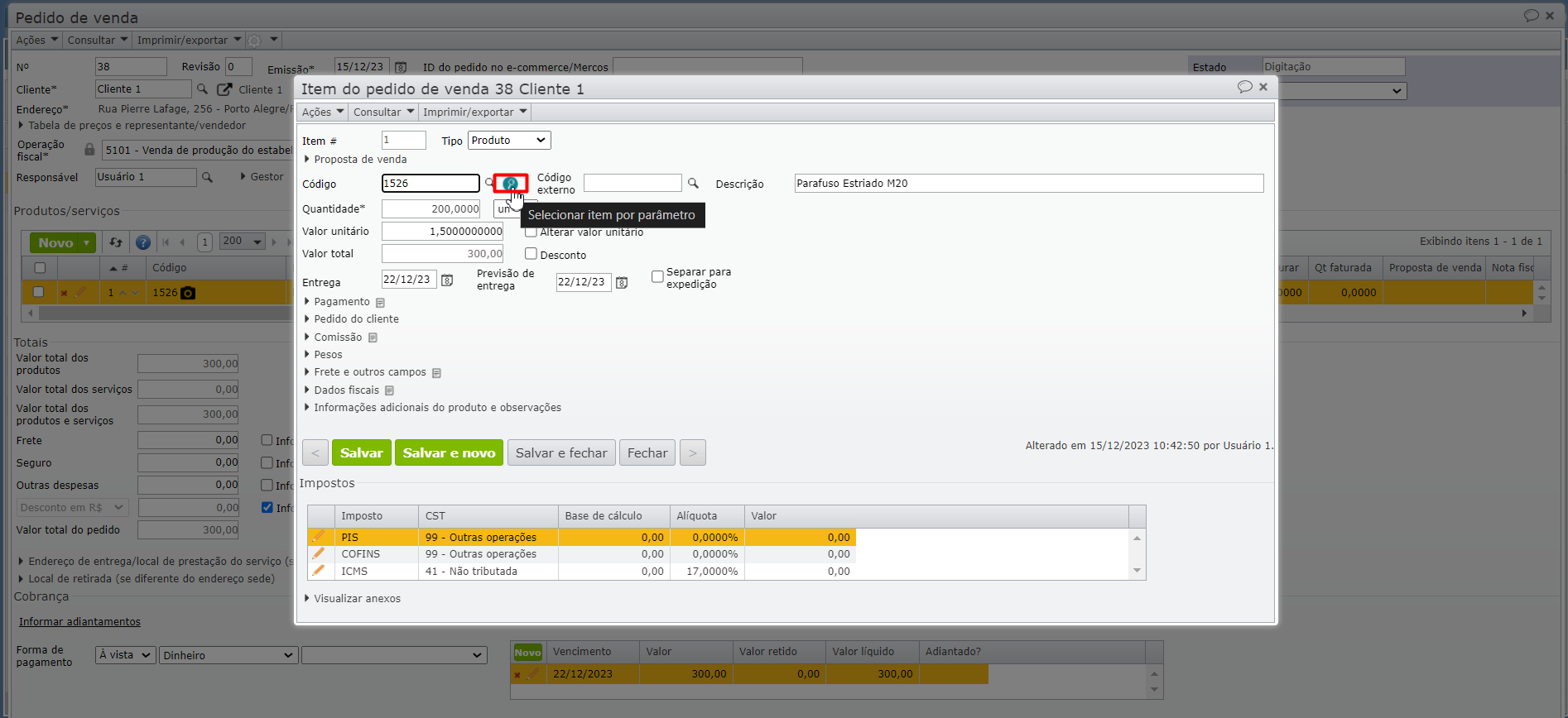 4) Pode-se procurar o item usando parâmetros ao montar uma proposta ou pedido de venda: na edição do item de pedido ou proposta, ao lado do campo “Código”, há uma lupa verde.