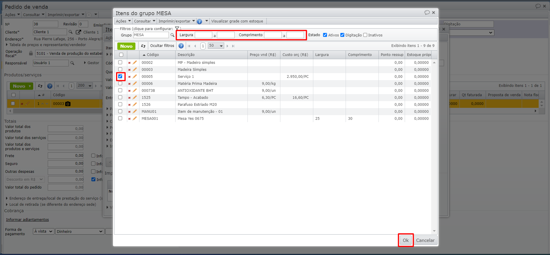 6) São exibidos os itens inseridos no grupo. Utilize os parâmetros para encontrar o item, selecione-o através da caixa de seleção e clique em “Ok”.