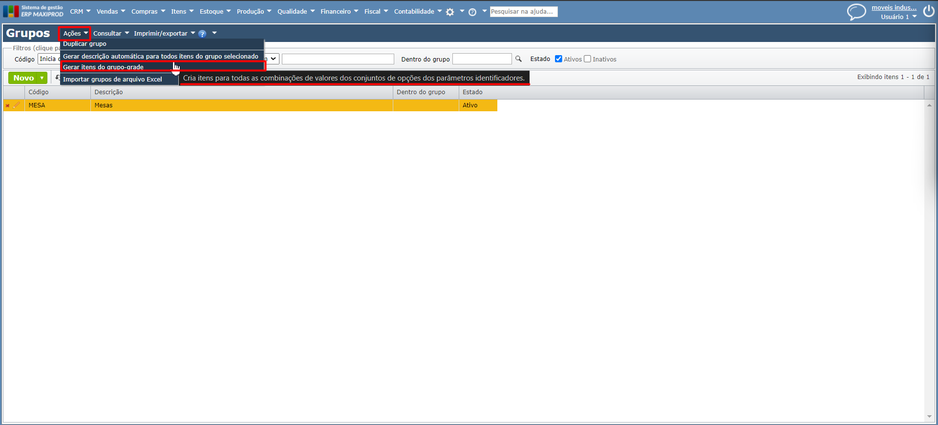 3) Há 24 combinações de valores para estes parâmetros, portanto 24 mesas diferentes. Ao invés de cadastrar cada uma das combinações, criando manualmente os novos itens, podemos criá-los automaticamente. Na tela de grupos, selecionamos o grupo desejado, e clicamos no menu “Ações > Gerar itens do grupo-grade”.
