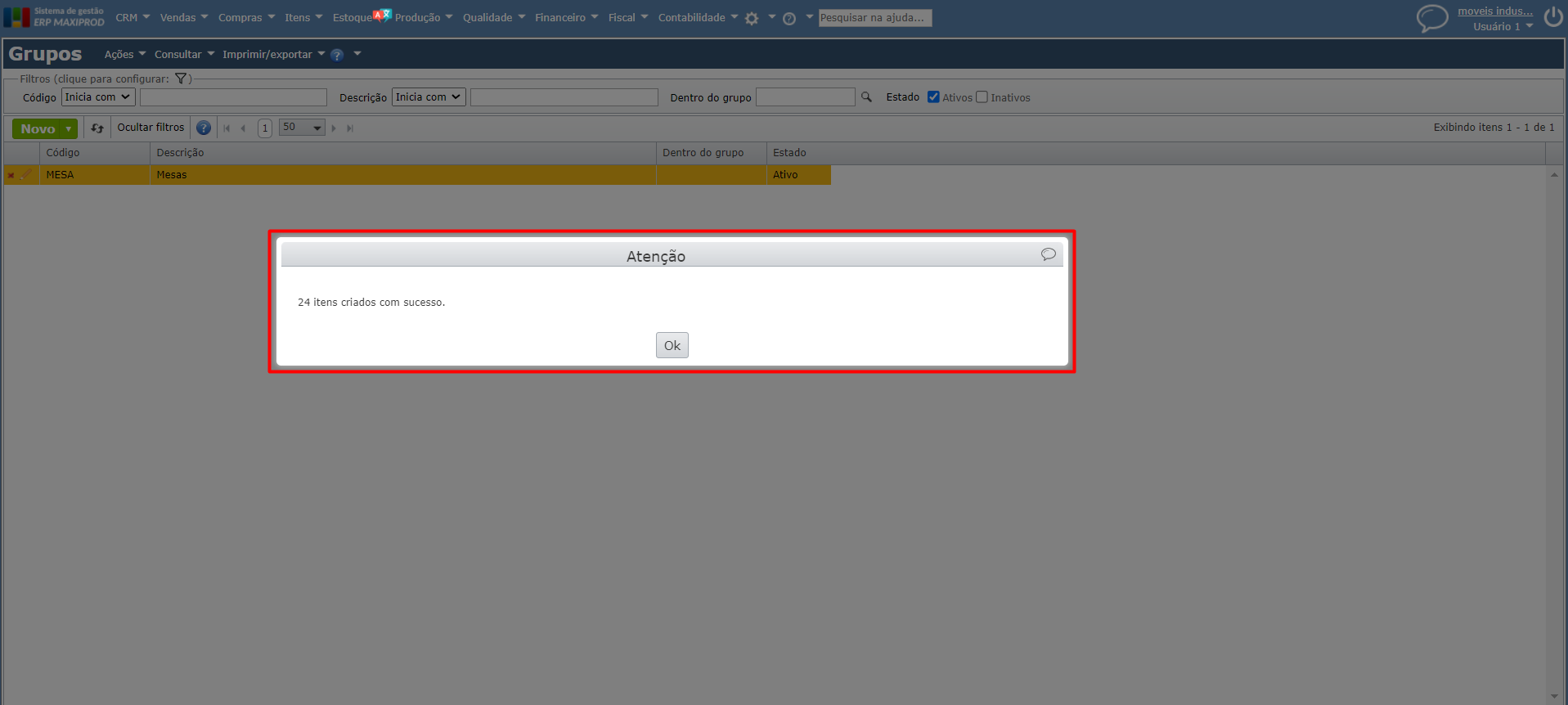 5) Ao consultar os itens do grupo, observa-se que todas as combinações foram cadastradas, gerando automaticamente os 24 itens.