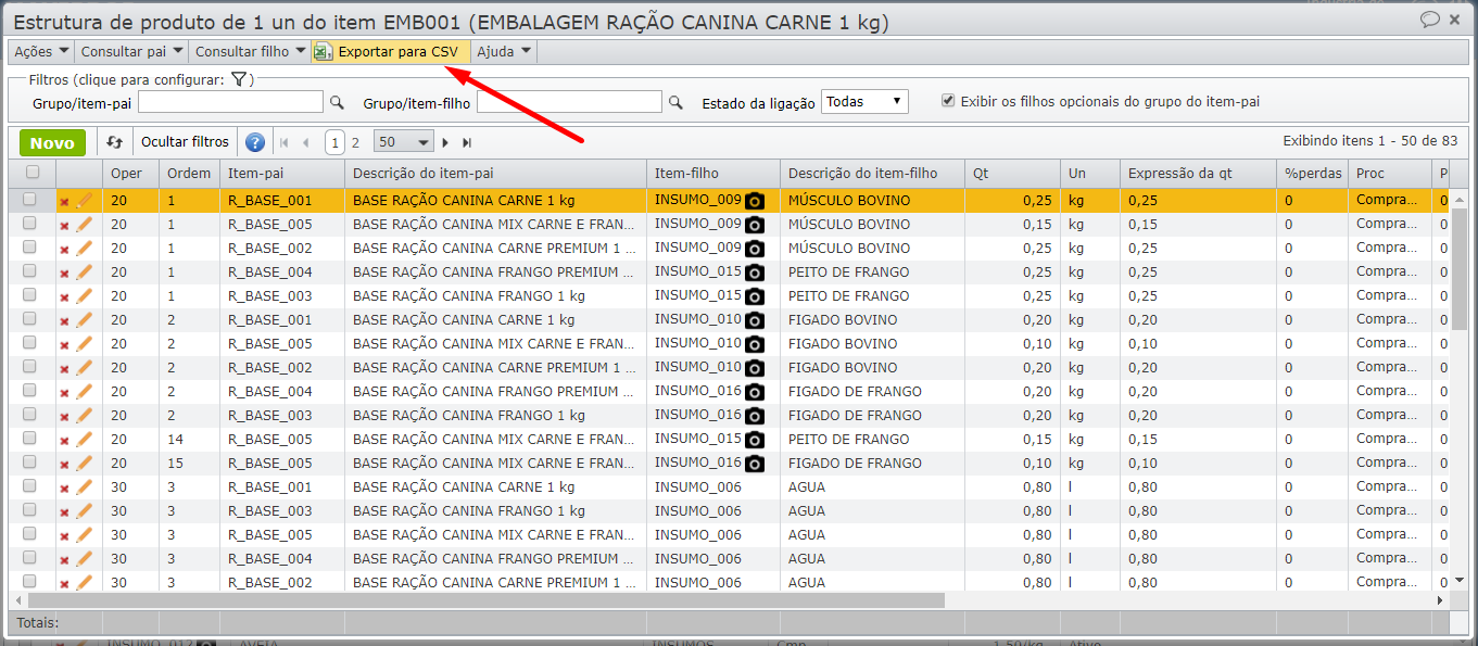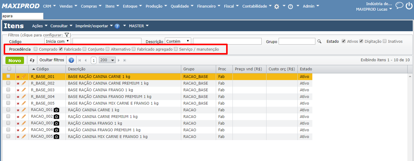 3) Vamos supor que precisemos apenas das estruturas dos itens fabricados. Para isso, filtramos na tela apenas os itens fabricados.