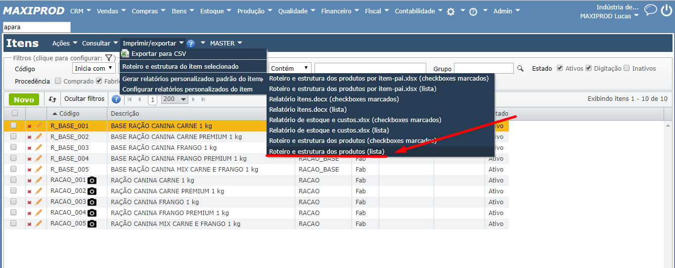 2) Na tela de itens, vá ao menu “Imprimir/Exportar” > “Gerar relatórios personalizados padrão dos itens”. Nesse menu, constam os relatórios Roteiro e estrutura dos produtos e Roteiro e estrutura dos itens por item-pai. Os relatórios podem ser gerados em Excel ou em PDF, e ambos podem ser gerados a partir da lista filtrada em tela, ou dos itens com o checkbox marcado.