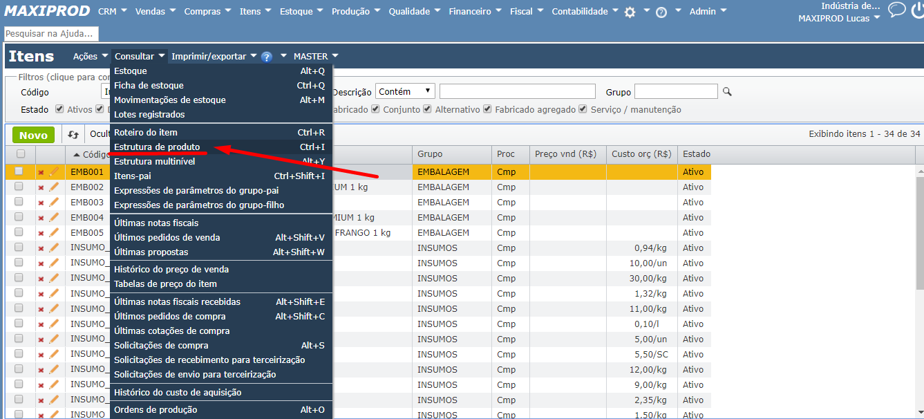 2) Na tela de itens, selecione qualquer item > menu “Consultar” > “Estrutura de produto”.