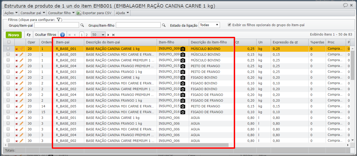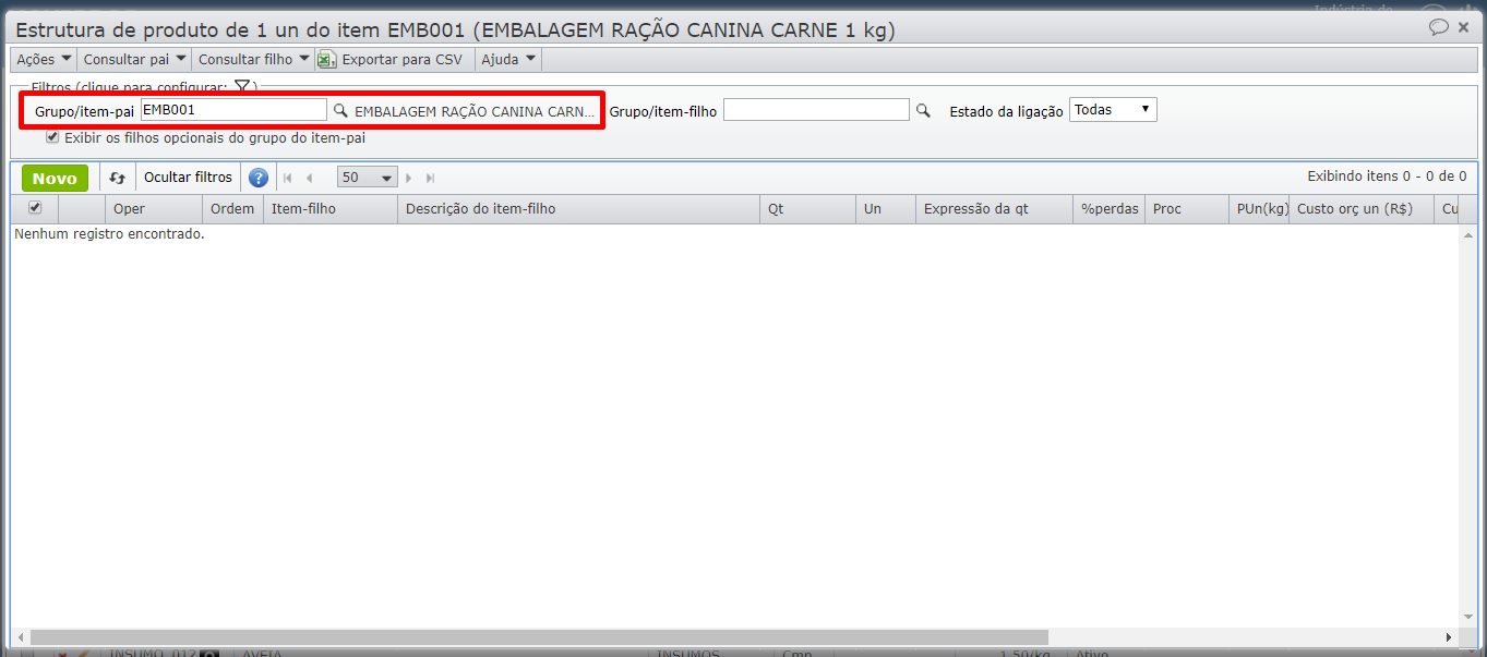 3) Por padrão, o sistema irá abrir a tela de estrutura de produto já filtrada pelo item selecionado, no filtro Grupo/item-pai.