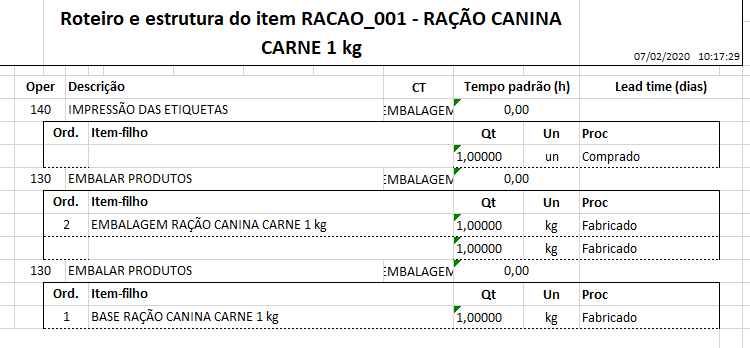 4) Geramos o relatório Roteiro e estrutura dos produtos (lista).