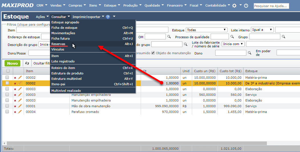 2) Na tela de Estoque, selecione o estoque que está tentando movimentar, através do menu “Consultar > Reservas”.