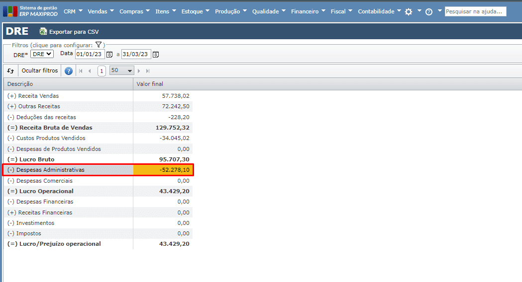 6) No plano de contas padrão do ERP Maxiprod, a conta contábil código “215 – Material de consumo”, tem o código de aglutinação “DRE_DSP_ADM”, que corresponde a “(-) Despesas Administrativas”. Portanto, na DRE padrão do ERP Maxiprod, os lançamentos contábeis para esta conta são contabilizados como “Despesas administrativas”.