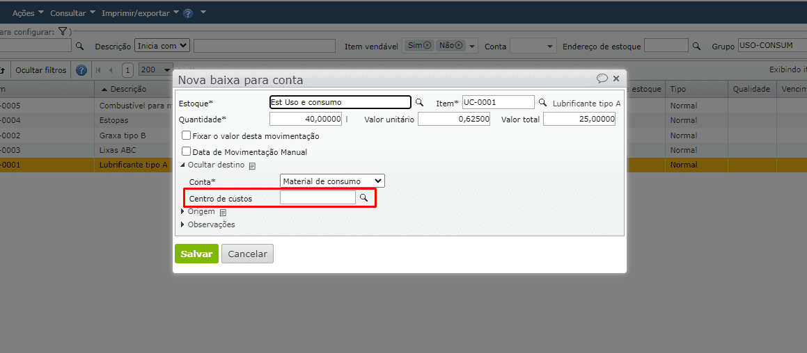 5) No plano de contas contábeis padrão do ERP Maxiprod, a conta cujo apelido é “Material de consumo” tem código “215”. Se a baixa é feita para esta conta, serão gerados lançamentos contábeis a débito nesta conta, ou seja, o destino do custo do estoque baixado será esta conta contábil. No plano padrão, a finalidade da conta “215 – Material de consumo” é “Despesa”. No entanto, a conta contábil a ser usada na nova baixa depende de cada empresa, que pode utilizar plano de contas contábeis próprio.