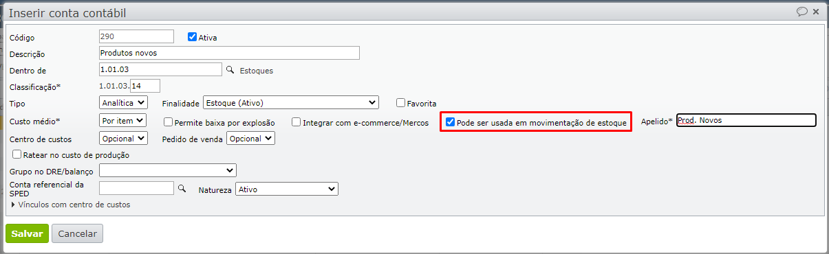 - “Apelido”: nome a ser mostrado na seleção desta conta na movimentação de estoque.