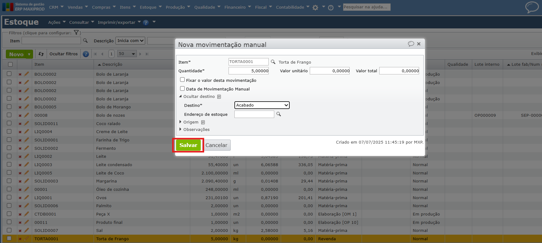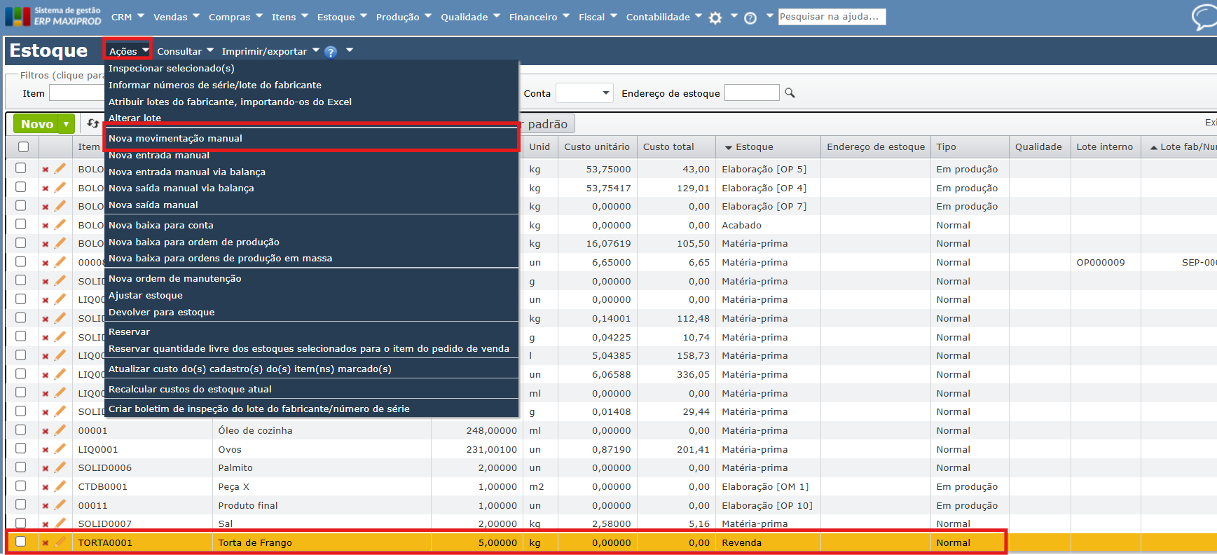 1) Para modificar a conta contábil de um item que já está no estoque, selecione o item no estoque (clique na linha de modo que ela fique destacada em laranja). Acesse o menu “Ações > Nova movimentação manual”.