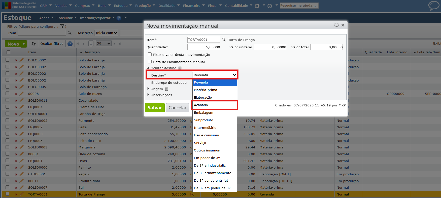 2) Na tela de movimentação, na seção “Destino”, selecione a nova conta (ex: “Acabado”).