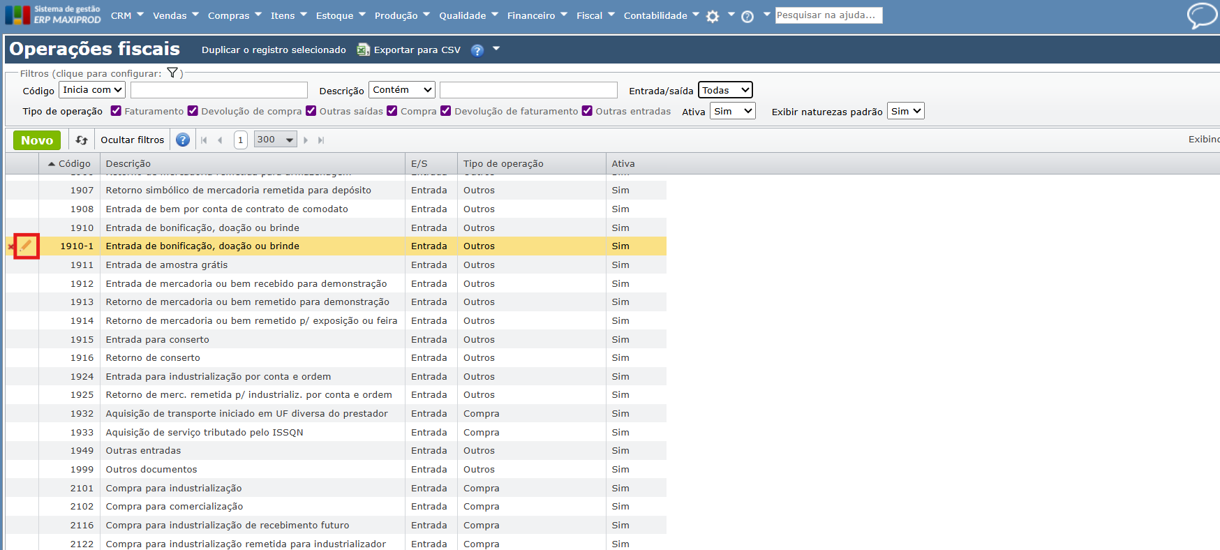 2) Procure pela operação fiscal utilizada nota fiscal, clique no ícone de lápis laranja para abrir a tela de edição.