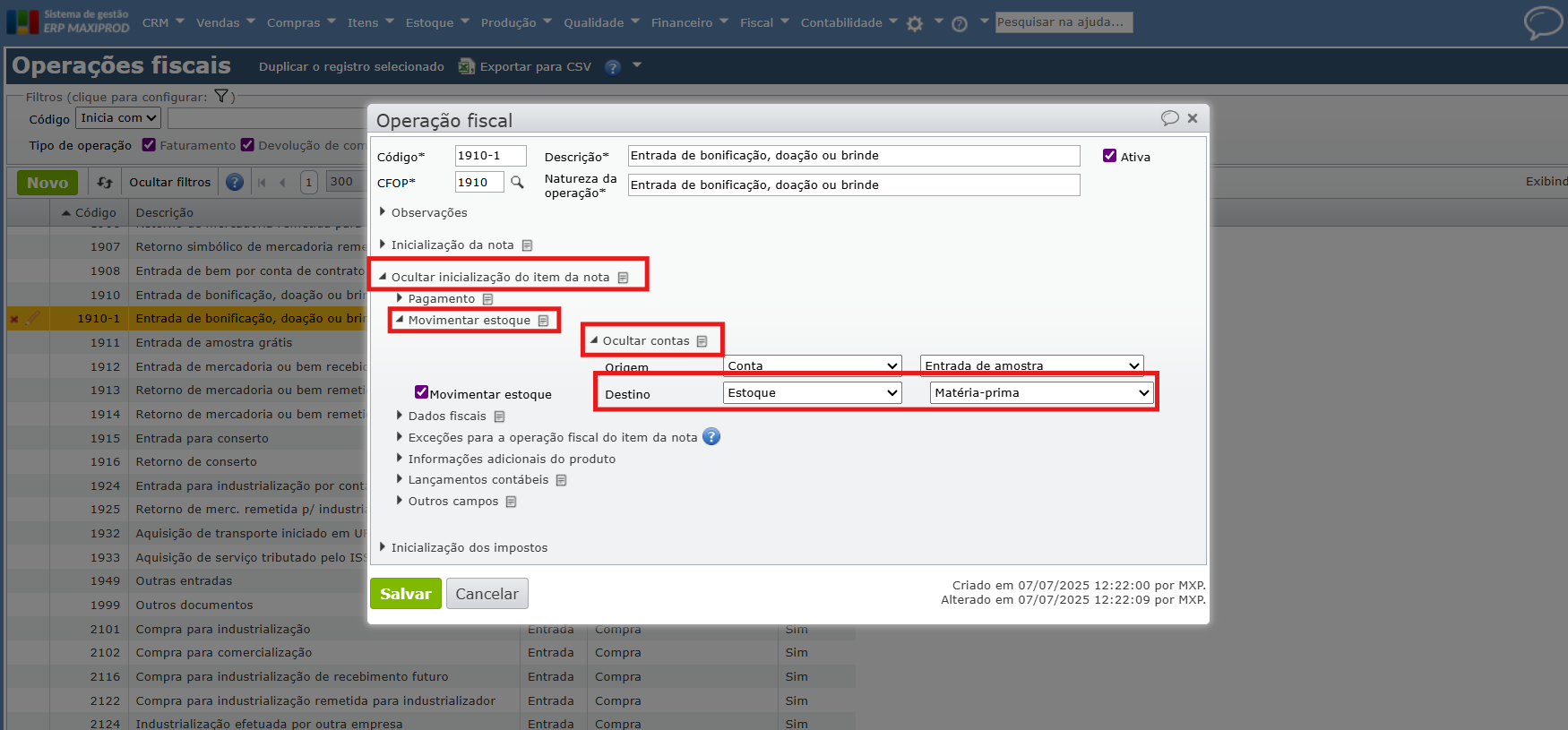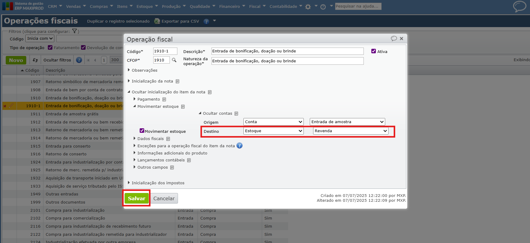 Observação: esta configuração afeta somente recebimentos futuros com esta operação fiscal. Para atualizar em notas existentes, é necessário que estas notas estejam no estado de “Digitação”, e o usuário utilize o menu “Ações > Atualizar dados dos itens conforme operação fiscal da NF”. Para saber como reabrir NF recebida, clique aqui.