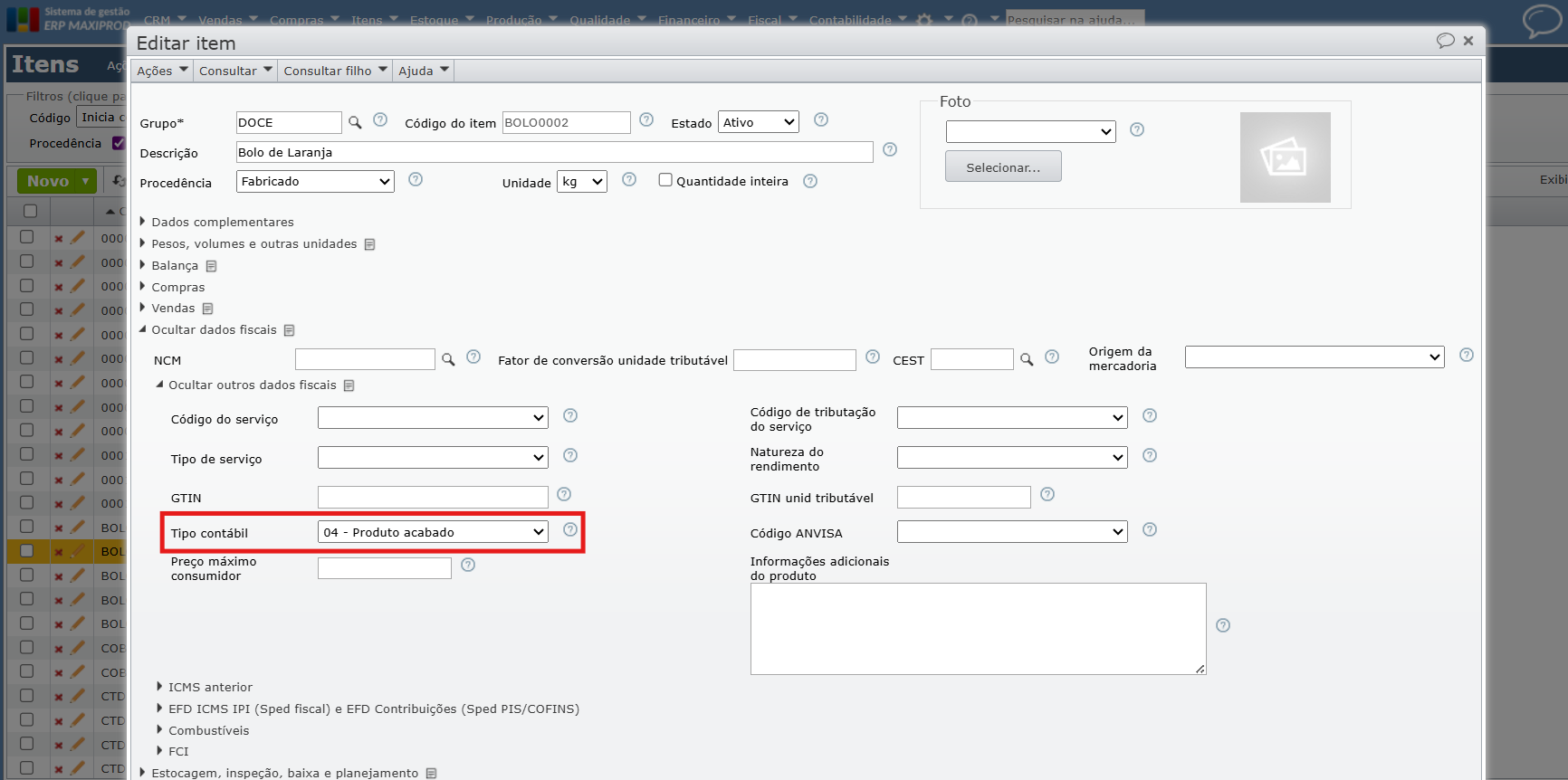 2) Se o item tem o tipo contábil “04 – Produto acabado”, e a conta na configuração para inicialização das movimentações deste tipo contábil é “Acabado” então, ao concluir uma ordem de produção deste item, o sistema inicializará a conta contábil cujo apelido é “Acabado” como conta de destino da conclusão da ordem de produção.