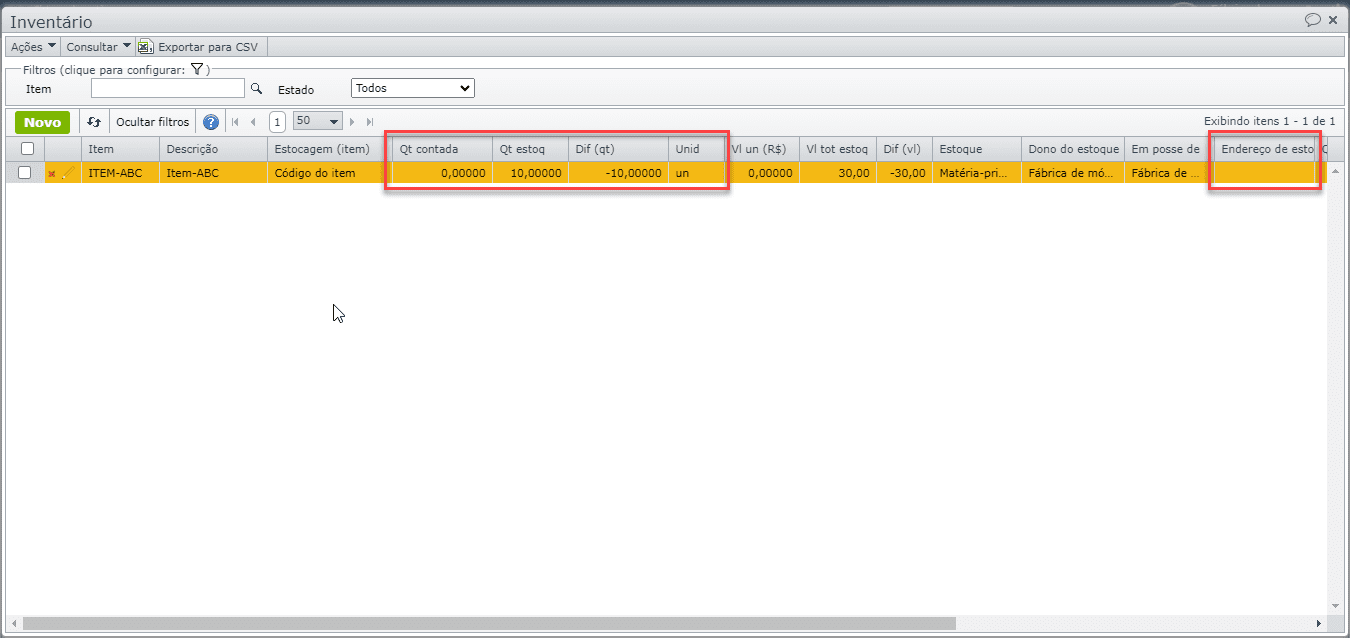 3) Portanto, no sistema, através do inventário, é necessário zerar o “Item ABC” sem endereço de estoque e na conta “Matéria-prima”, para que a linha referente a este estoque fique com quantidade igual a zero.