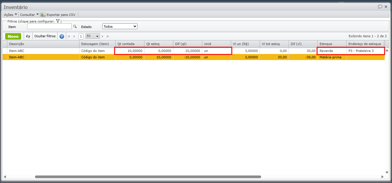 2) Durante a contagem do estoque, foi observado que essas 10 unidades do “Item ABC” estão na prateleira 3, identificada no sistema pelo código “P3”, classificado como estoque de revenda.