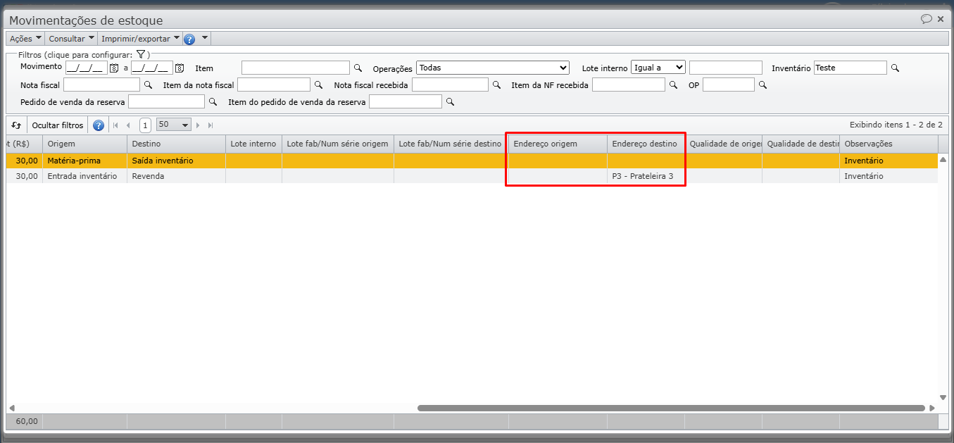3) Por isso, para mudar o endereço, conta ou lote de algum estoque por meio de inventário, é necessário criar uma linha zerando o estoque atual, e em outra linha indicar a quantidade com o endereço, conta ou lote correto.
