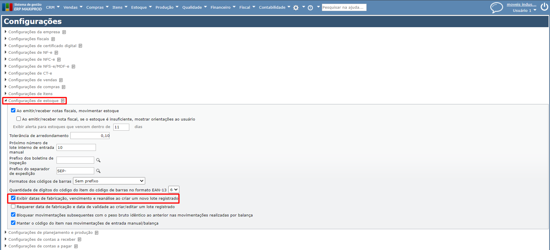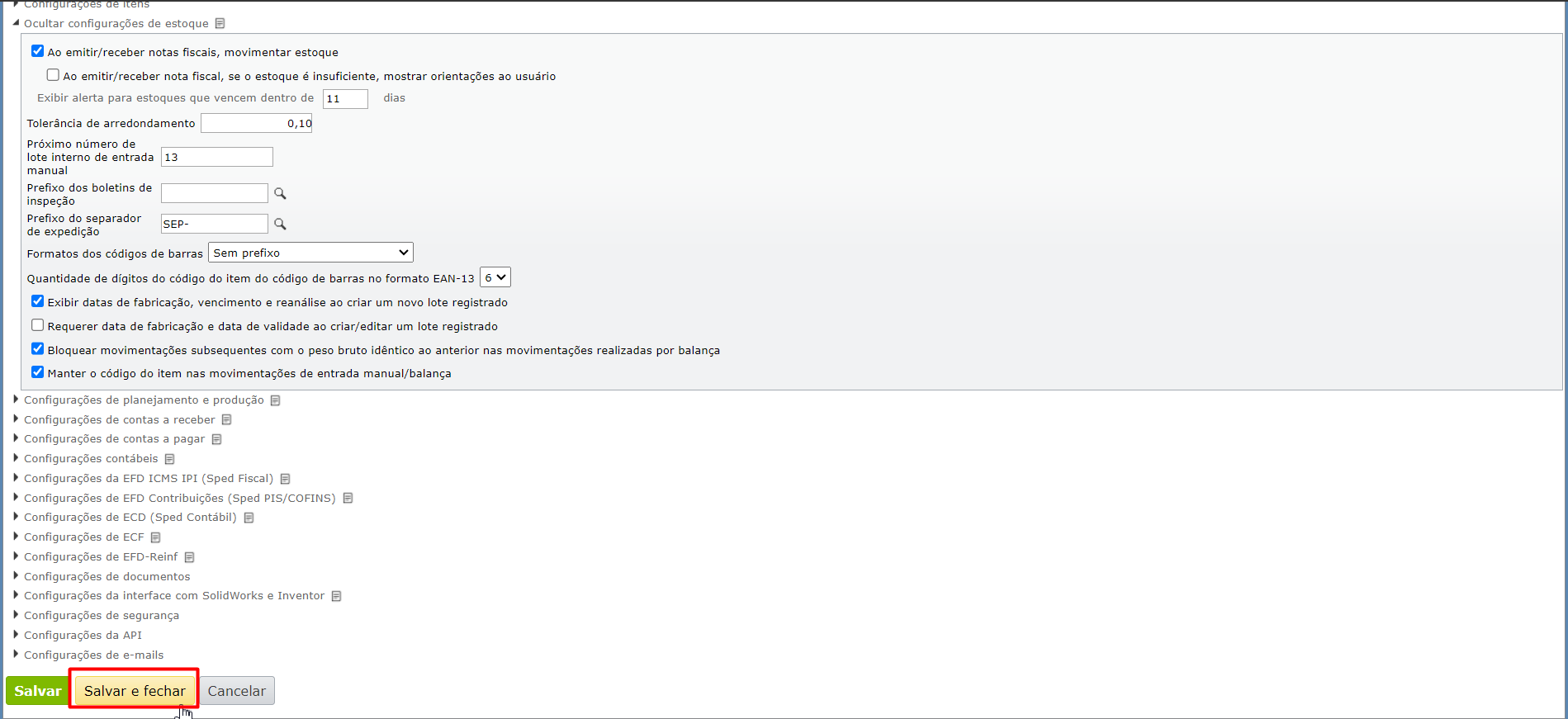 2) A seguir, clique na aba “Configurações de estoque” e marque a opção “Exibir datas de fabricação, vencimento e reanálise ao criar um novo lote registrado“.