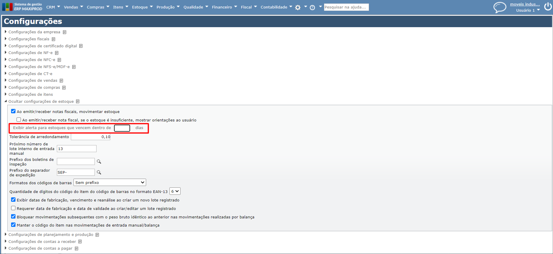 3) Ao marcar a opção acima, o campo “Exibir alerta para estoques que vencem dentro de ___ dias” se torna visível. Neste espaço, ajusta-se o alerta para os estoques que estão prestes a vencer no intervalo definido.