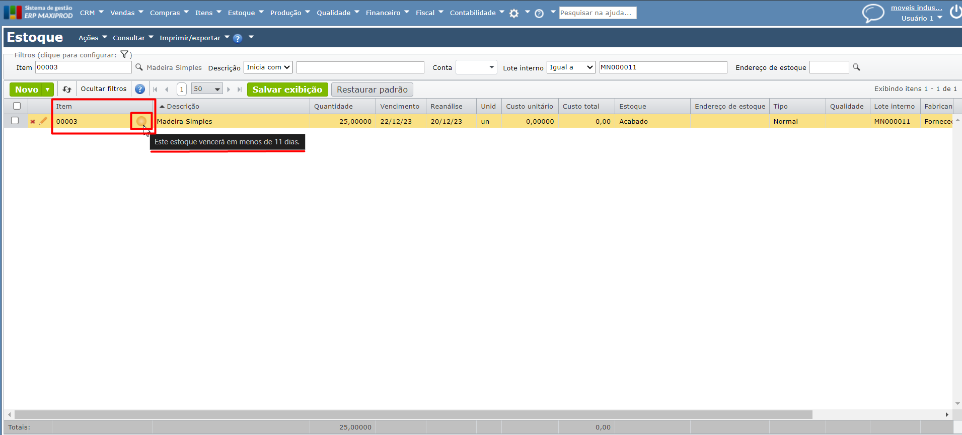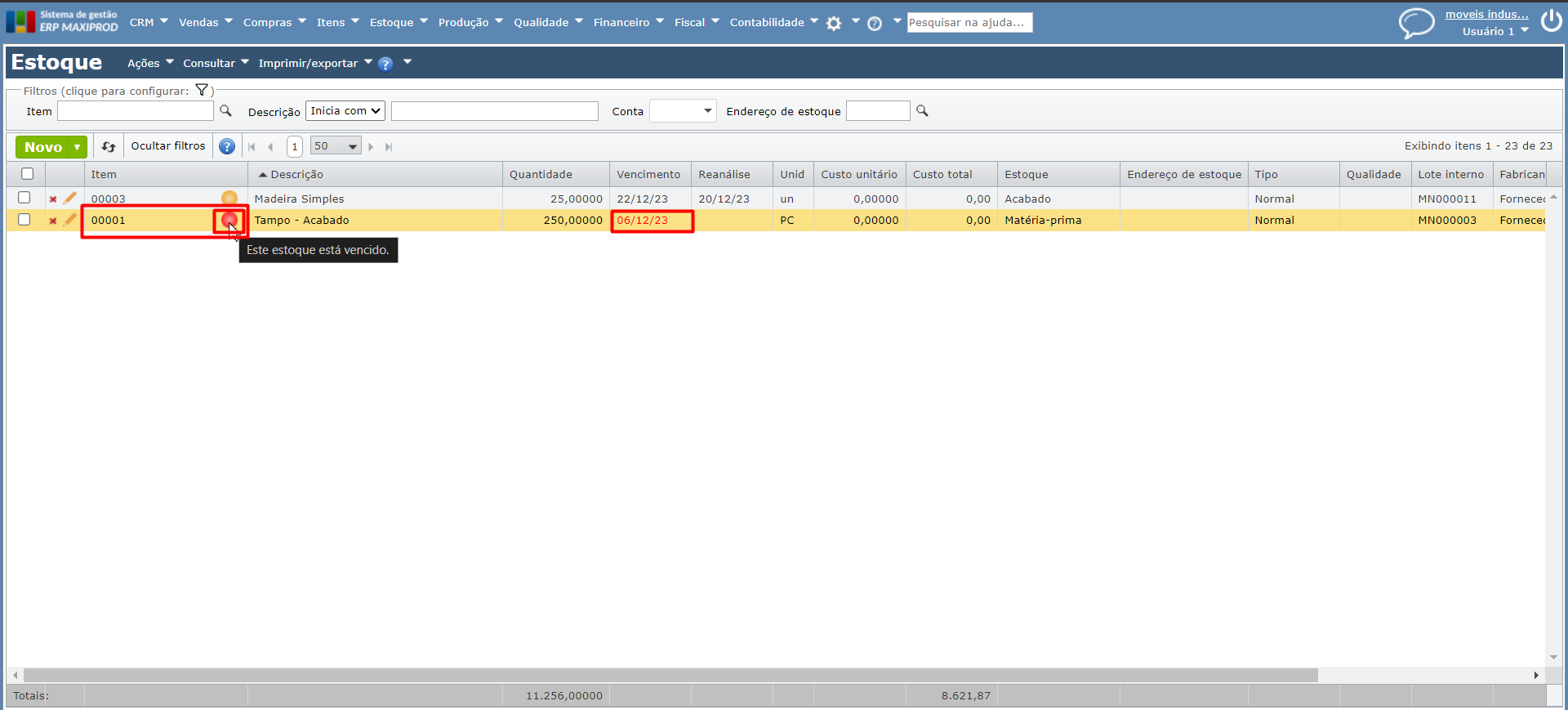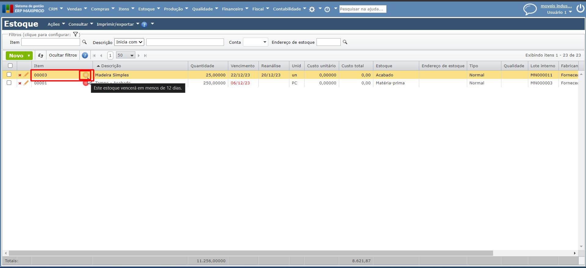 O ERP MAXIPROD controla os lotes por data de vencimento, no caso de itens com estocagem por “Lote do fabricante” ou “Lote interno“.  Esta página mostra como configurar este controle, definindo alertas na tela de Estoque, para itens com lotes vencidos ou prestes a vencer.