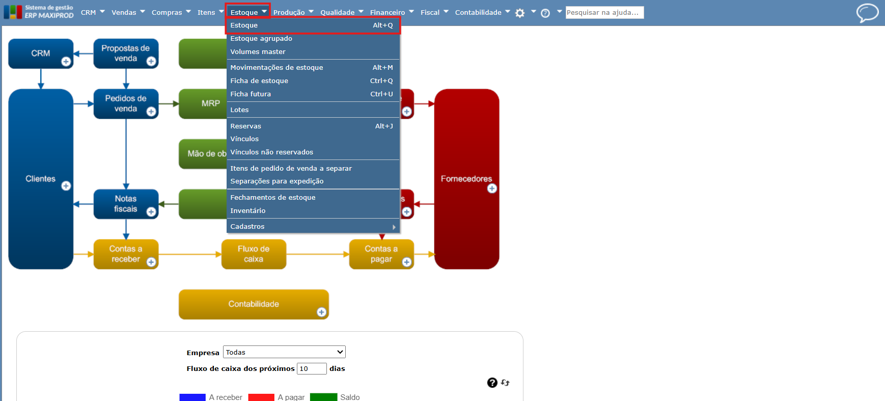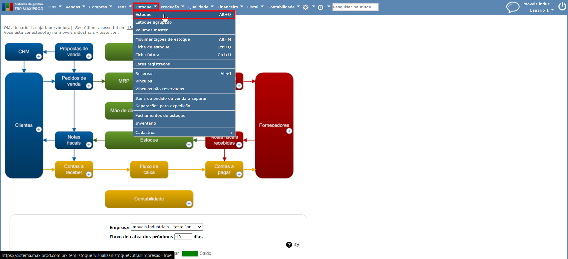 1) Feita a configuração explicada no tópico anterior, acesse o menu “Estoque > Estoque”.