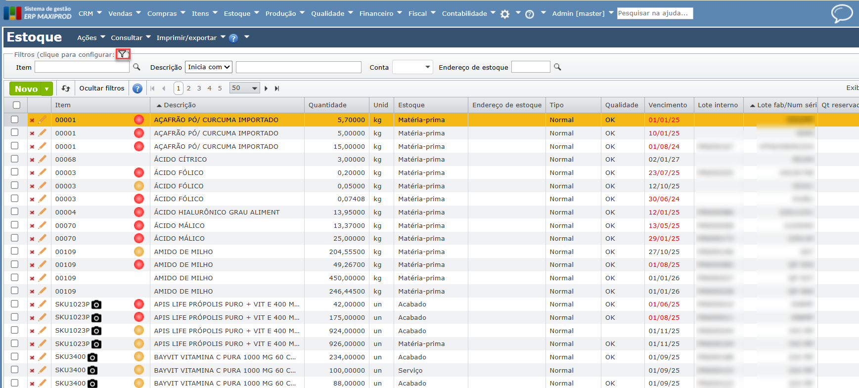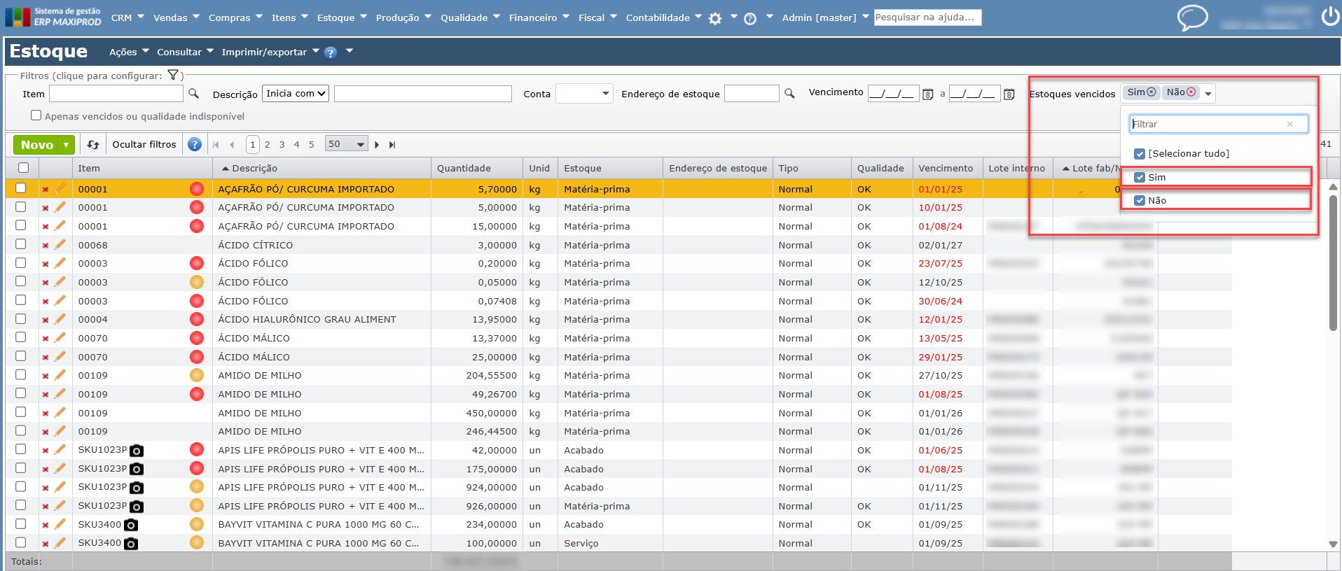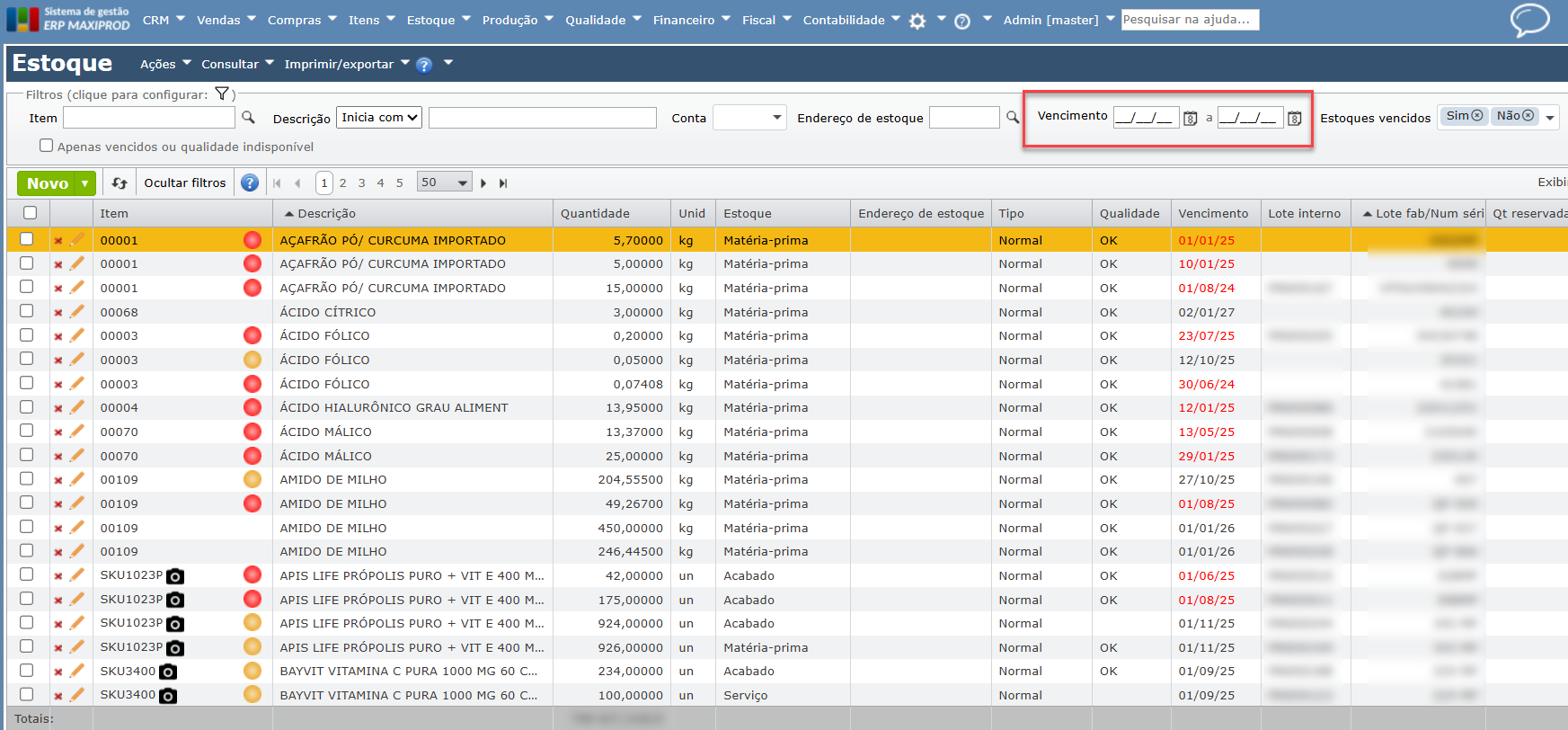 Como filtrar matérias-primas prestes a vencer ou vencidas no estoque?