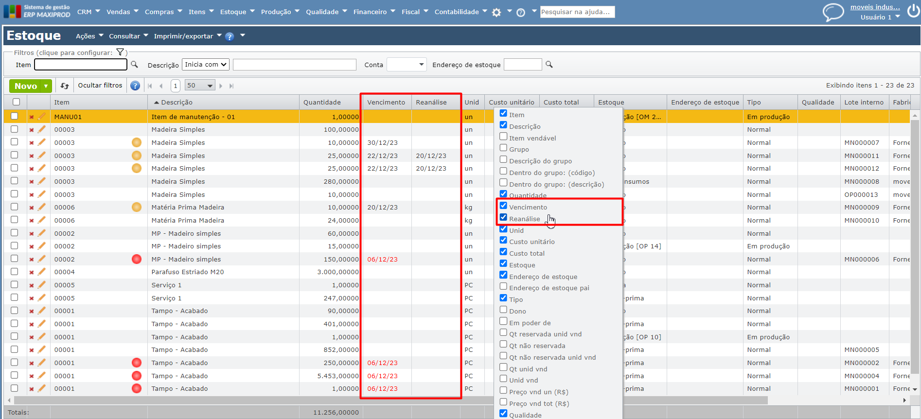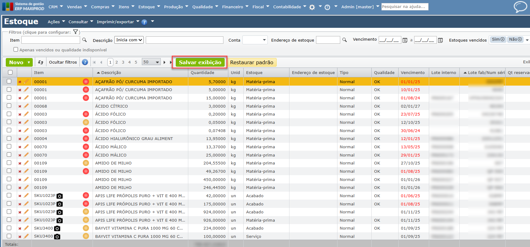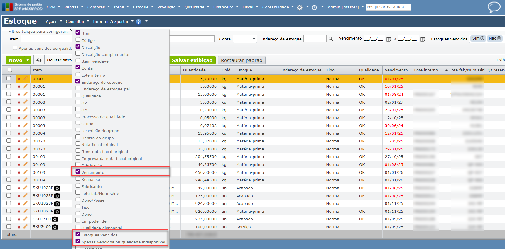 Como filtrar matérias-primas prestes a vencer ou vencidas no estoque?