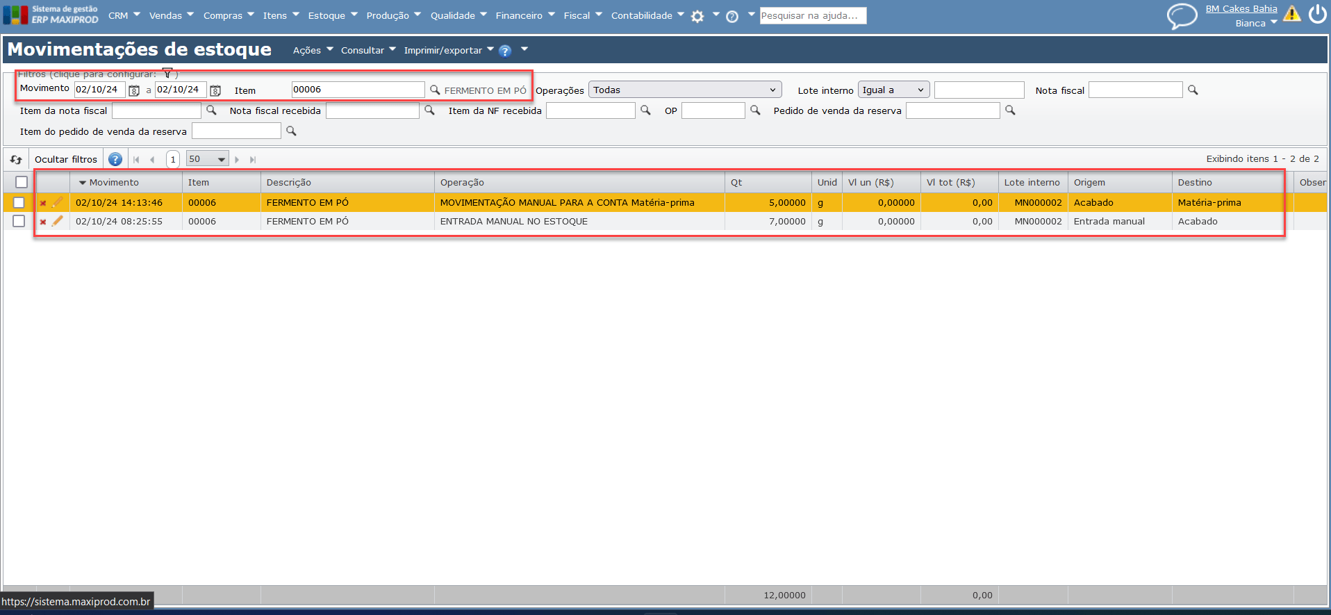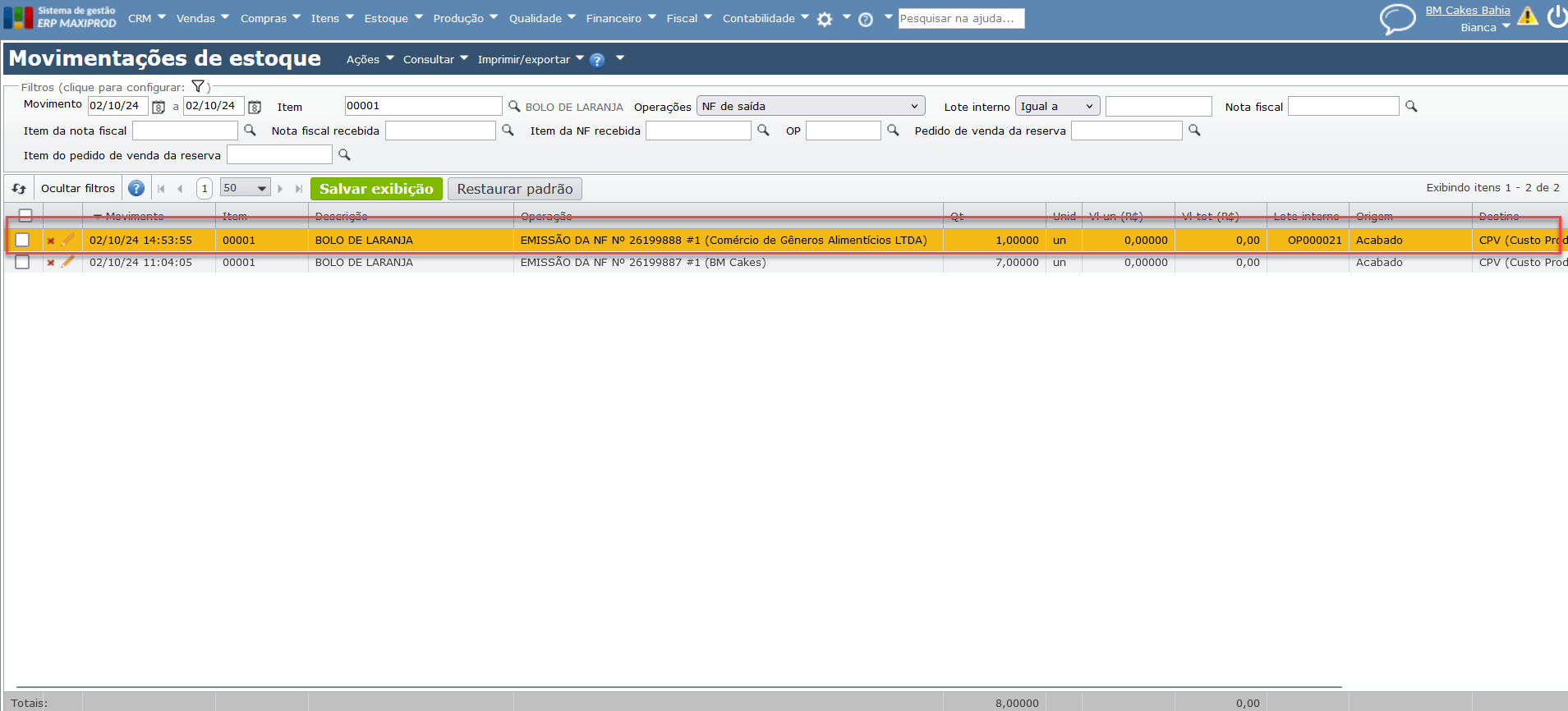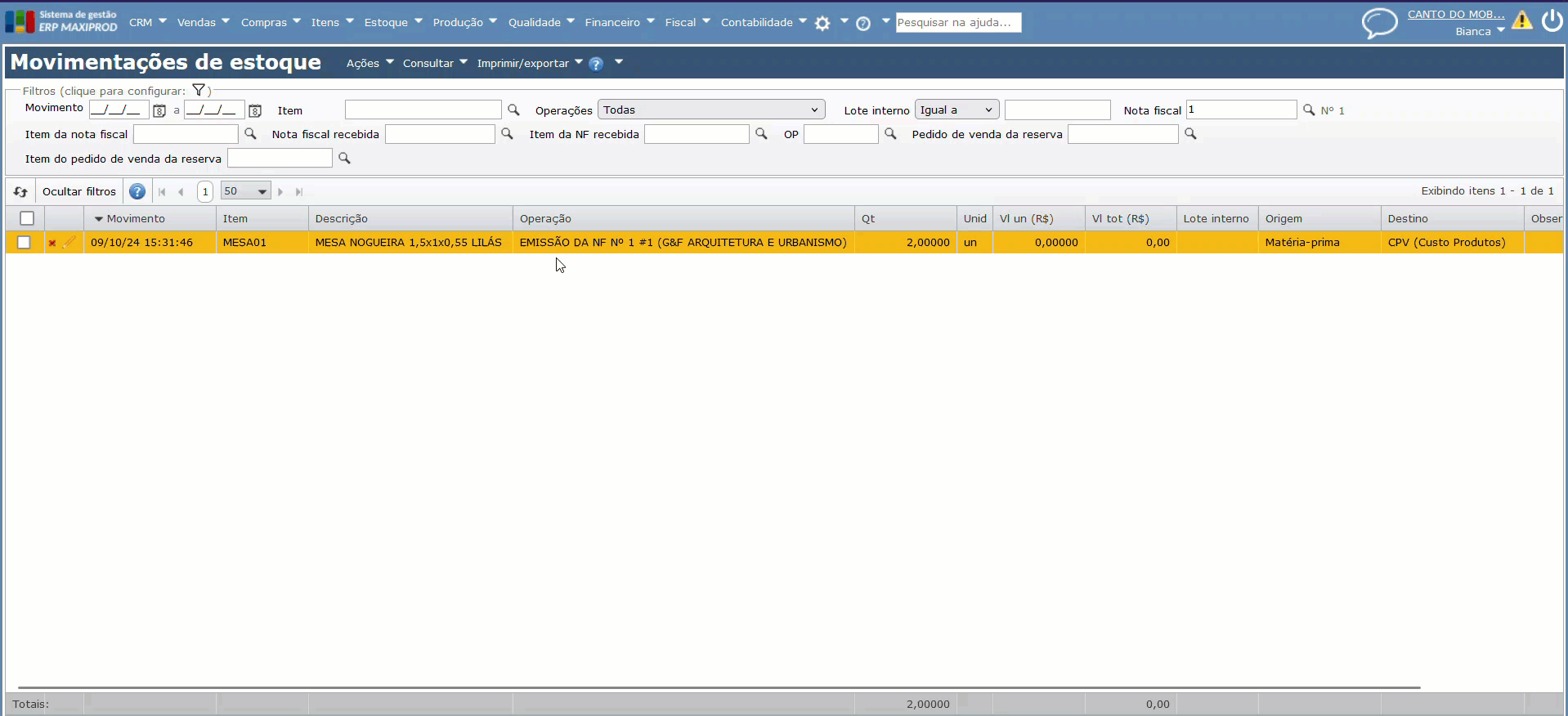 2) A seguir, procure o item cuja movimentação deseja desfazer. Pode-se usar os campos “Item” e “Movimento” para facilitar a localização da movimentação.