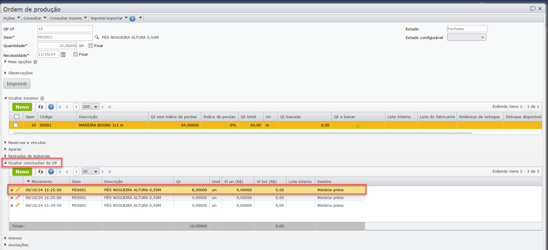 3) A exclusão da movimentação de conclusão da OP, também pode ser feita de uma terceira maneira, sendo diretamente dentro da OP. Ao filtrar pelo estado das OPs fechadas, abra a OP desejada e na sessão “Conclusões da OP“, exclua o registro da conclusão: