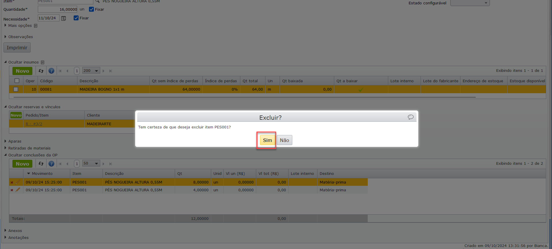 a) Neste cenário, houveram 3 conclusões parciais do produto até completar sua produção, com isto, pode-se excluir apenas a quantidade desejada ou, apagar todos os registros, para uma abertura completa da ordem de produção.