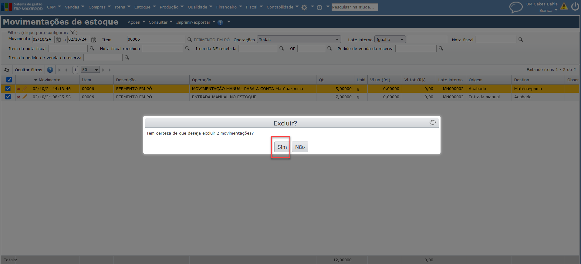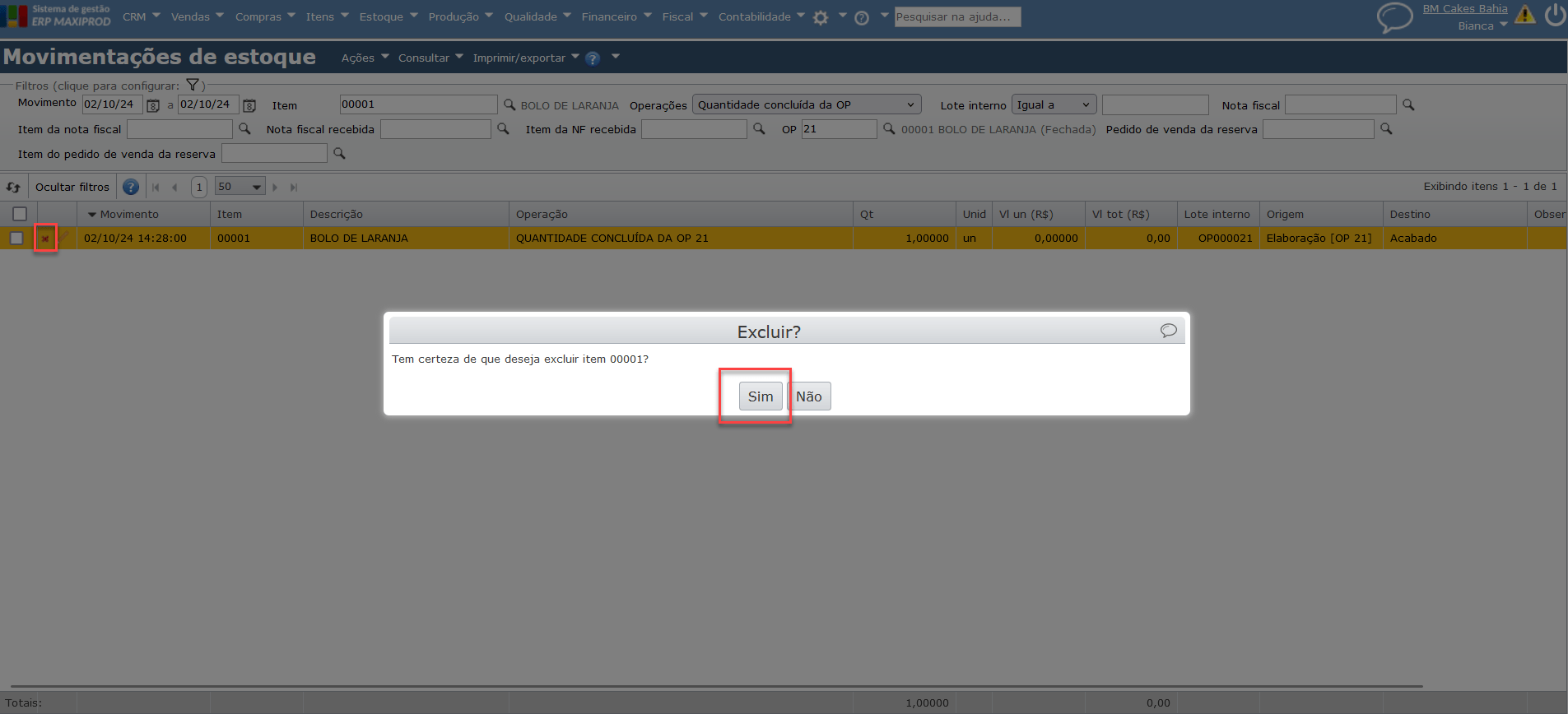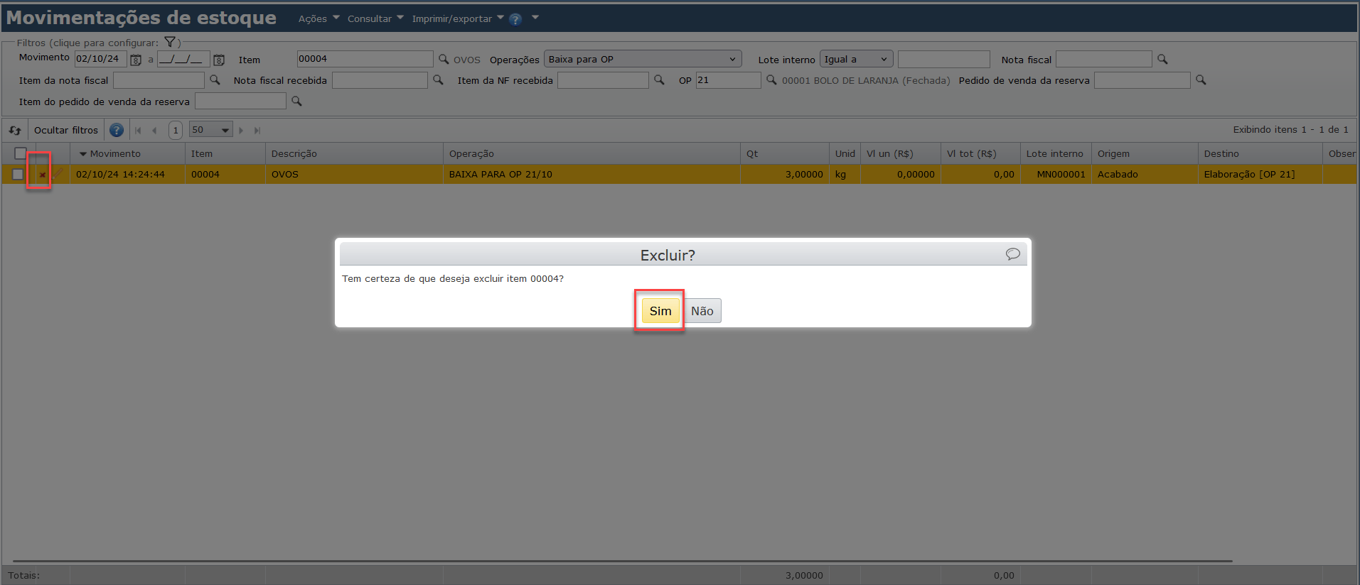 a) Após localizar a movimentação de estoque a excluir, clique no ícone “X” ao lado esquerdo do registro e confirme a exclusão clicando no botão “Sim”.