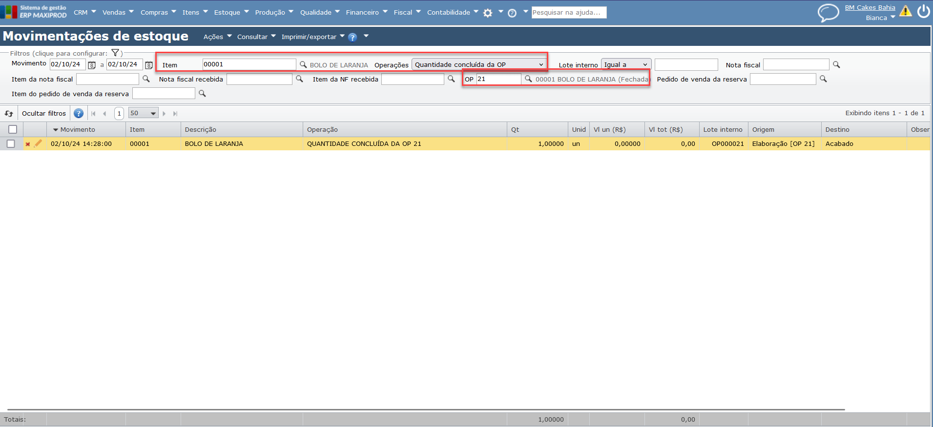 A conclusão de uma OP gera registros de movimentações de estoque do produto concluído e também de cada insumo baixado na produção. Ao desconcluir ou excluir um registro de conclusão de OP, o produto é removido do estoque e a OP volta ao estado “A produzir”.