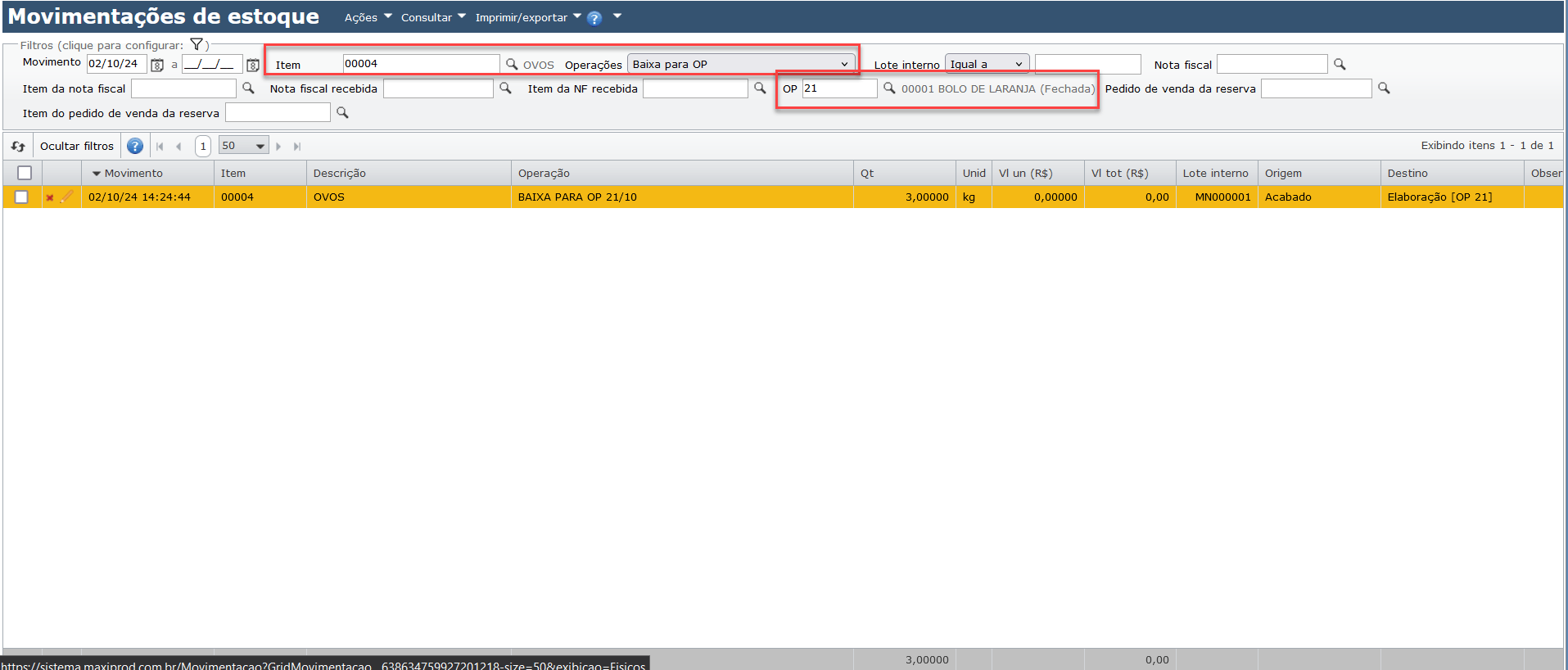 a) Pode-se também excluir as movimentações de baixa do insumo pela tela de “Estoque > Movimentações de estoque“. Procure o item e a operação “Baixa para OP“. Pode-se também filtrar pelo número da OP.