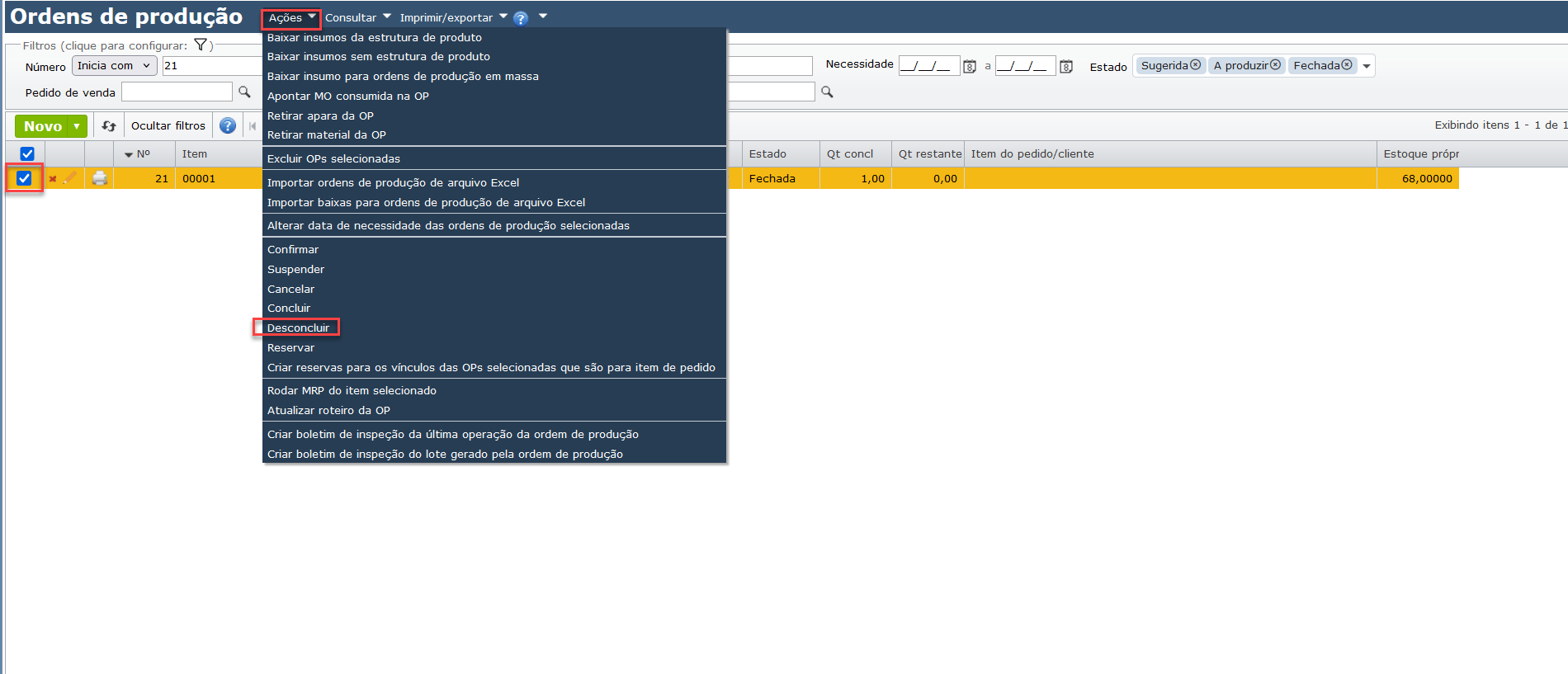 1) Pode-se desconcluir uma OP, selecionando-a e acessando o submenu “Ações > Desconcluir“. Automaticamente, o registro de estoque do produto concluído será excluído.