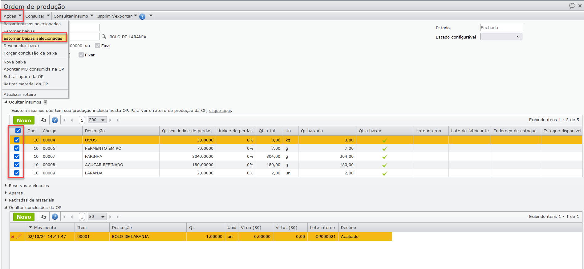 4) A movimentação de baixa do insumo só pode ser excluída após excluir a movimentação de conclusão do produto final (passos anteriores). Agora, para desfazer as movimentações de baixa de insumos para a OP, abra a OP, selecione todos os insumos e clique no submenu “Ações > Estornar baixas selecionadas“. Ou então, clique diretamente no ícone verde “V” de cada insumo, na coluna “Qt a baixar“.