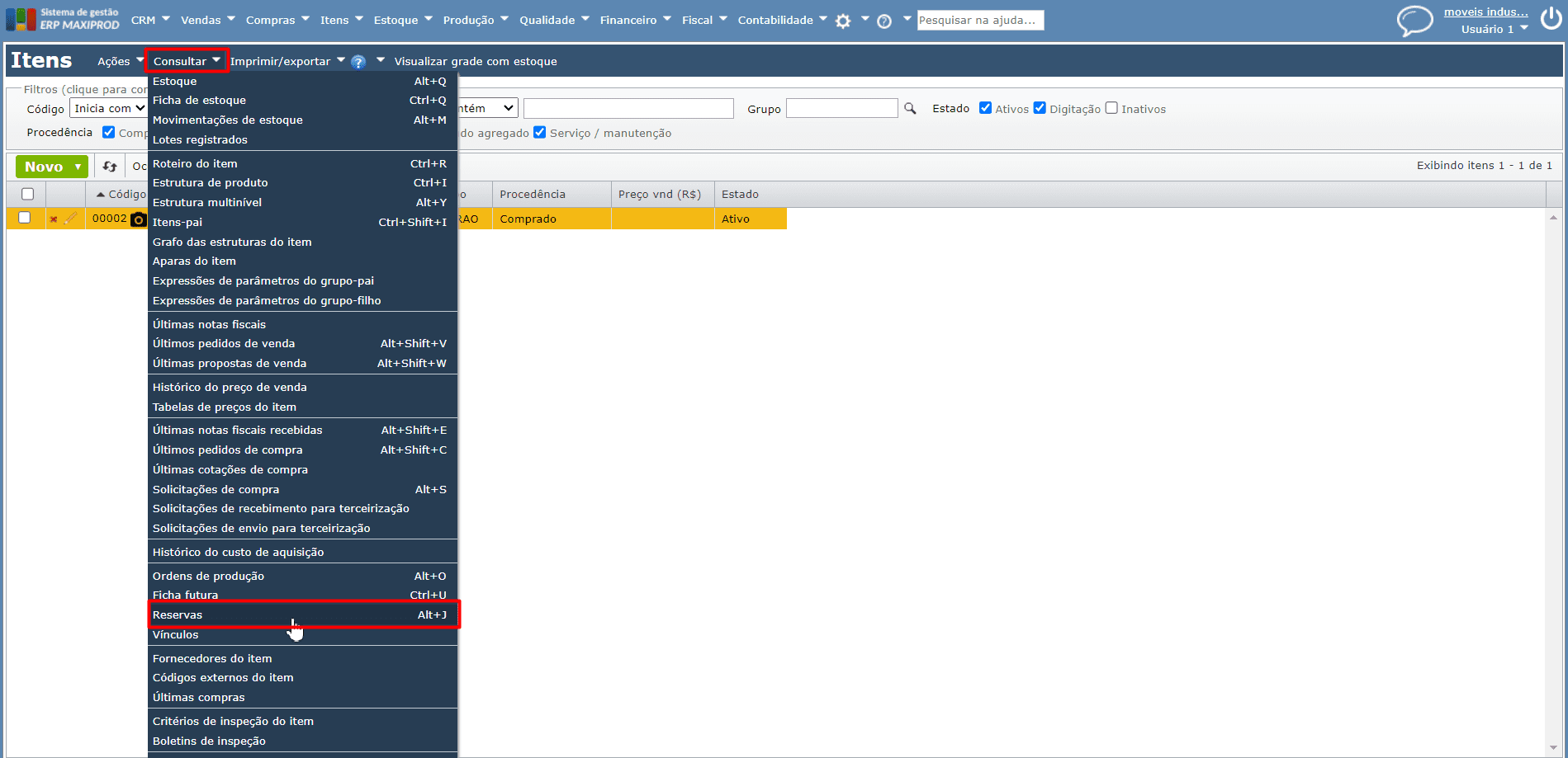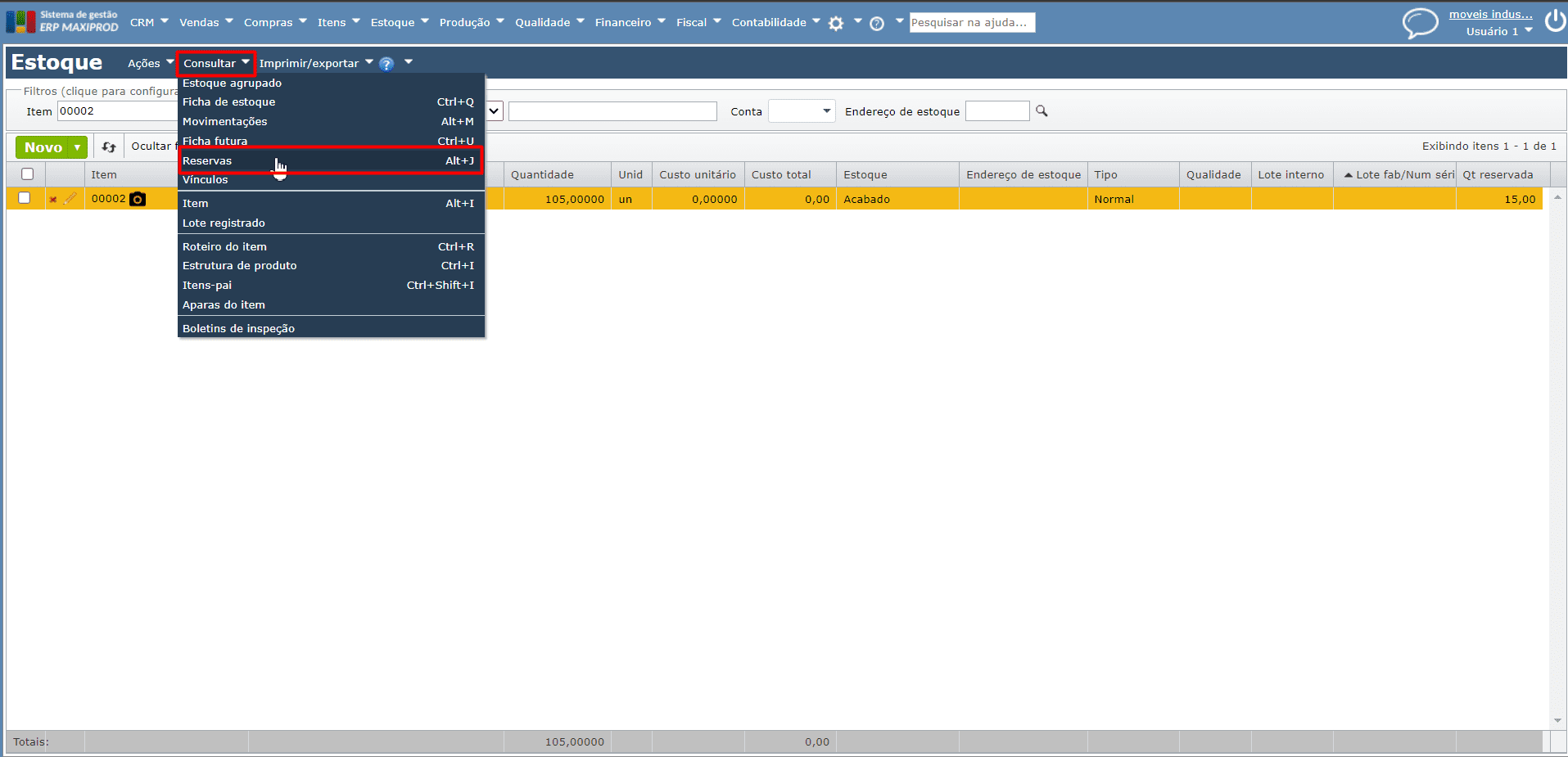 2) Identifique o item cujas reservas deseja desfazer, clique nele acesse o menu “Consultar > Reservas”.