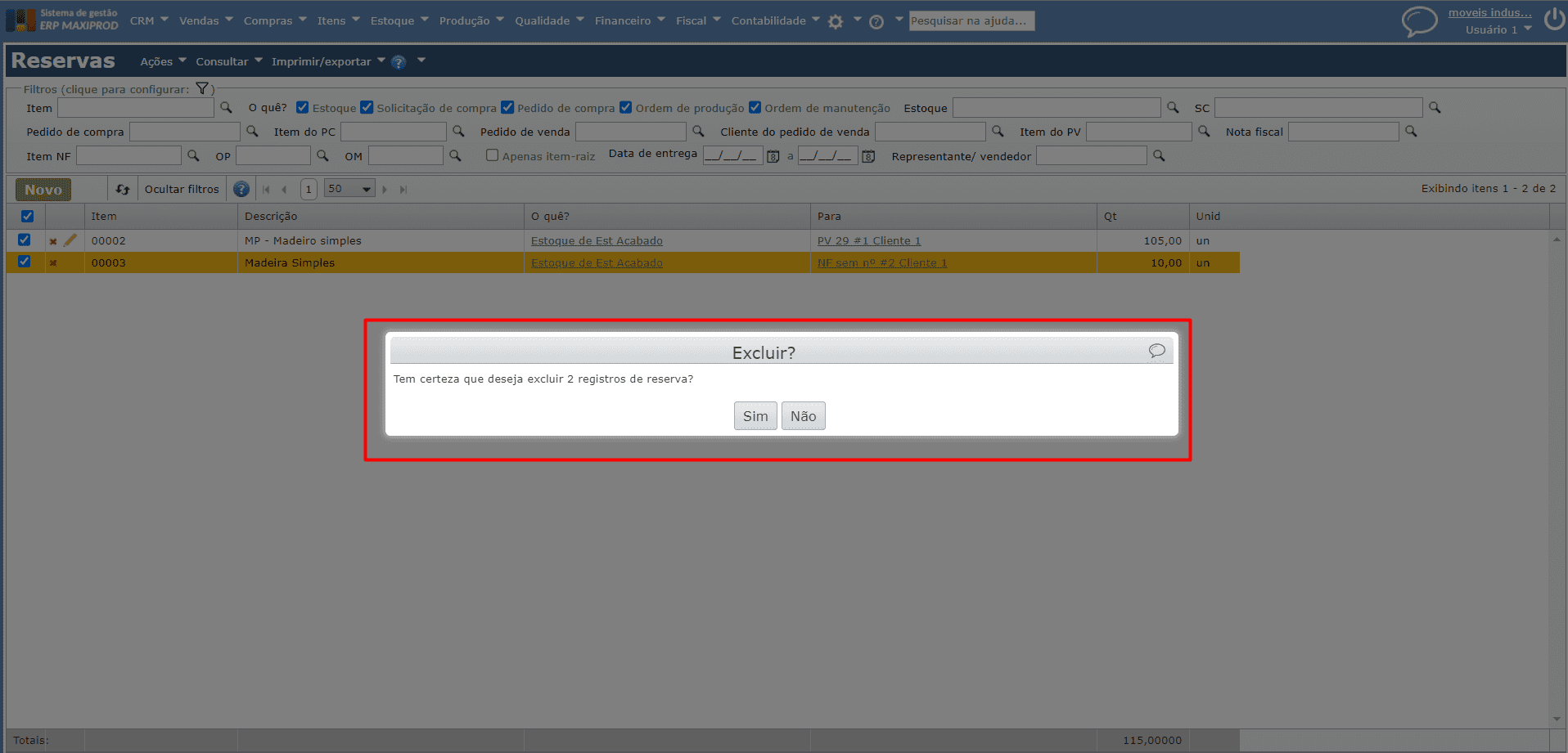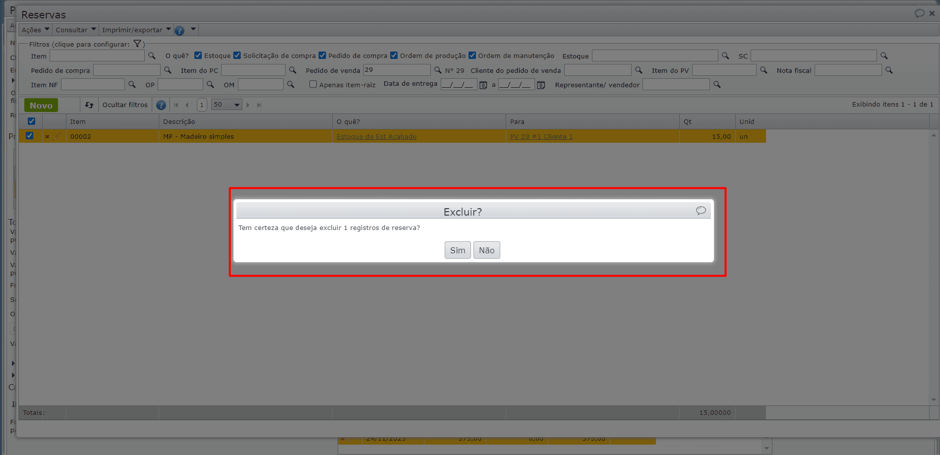4) Ao clicar em “Sim“, as reservas selecionadas serão desfeitas.