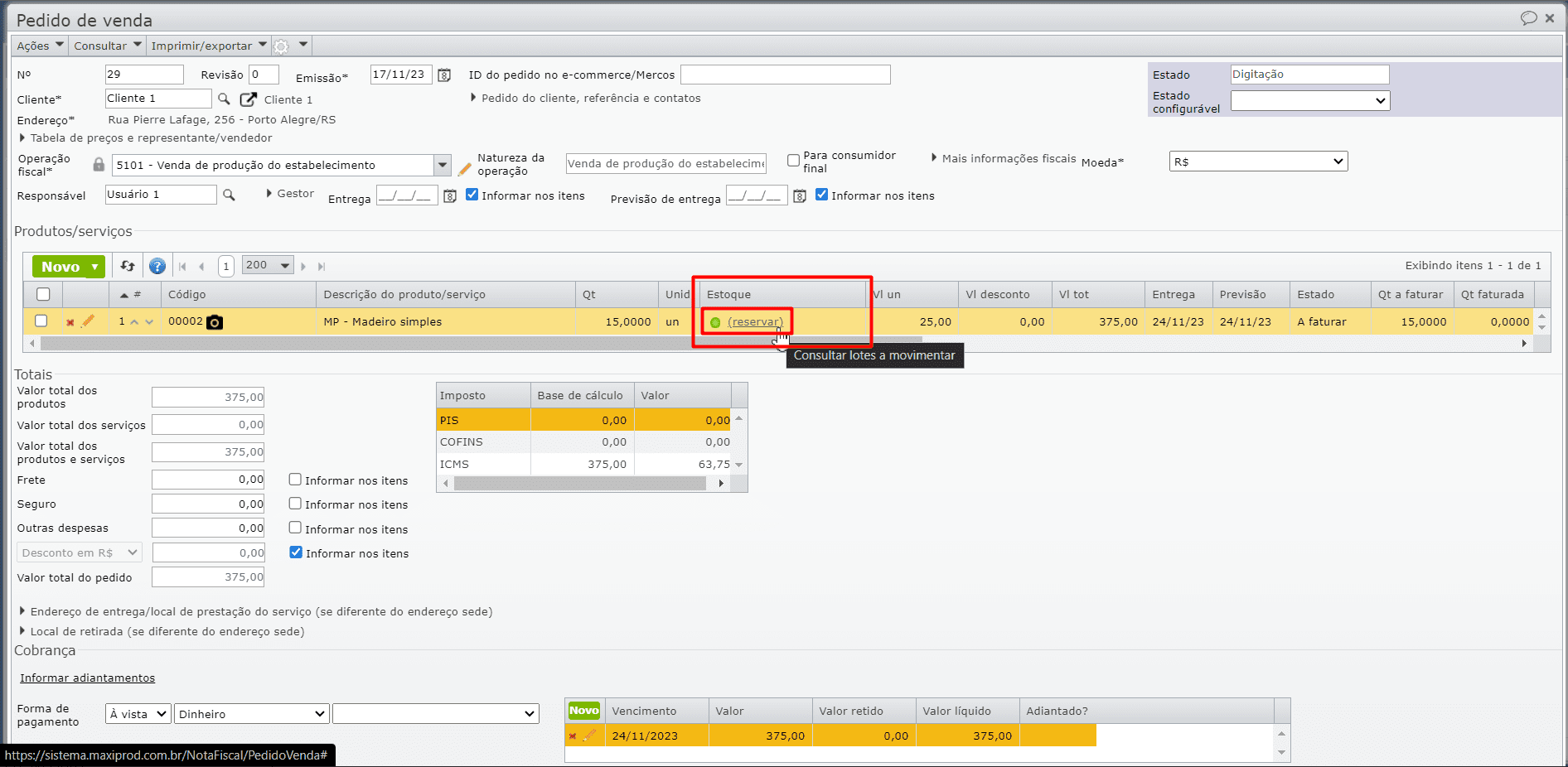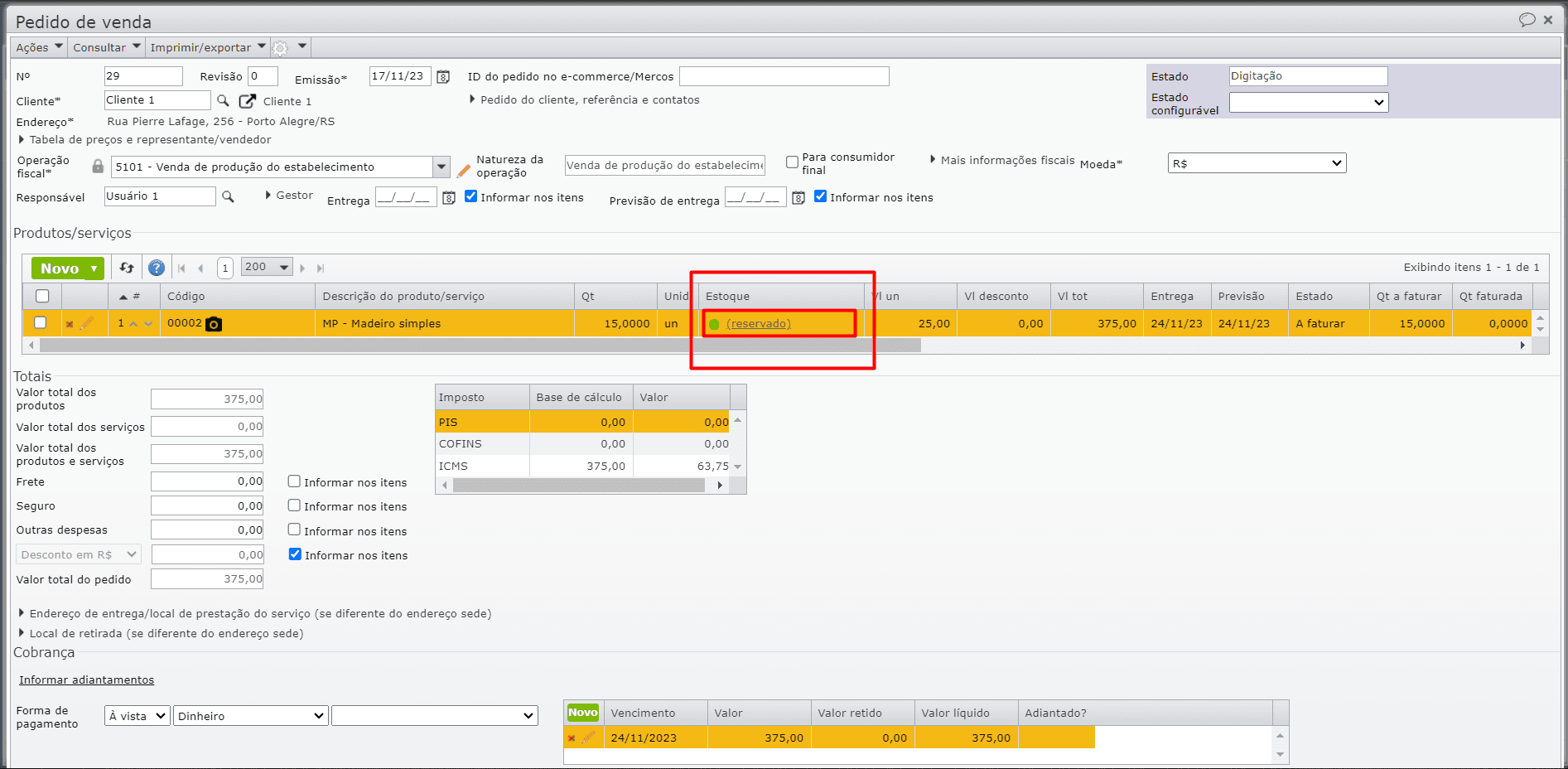5) Na tela do pedido de venda, a descrição da coluna “Estoque” do item não estará com a descrição “Reservado“.