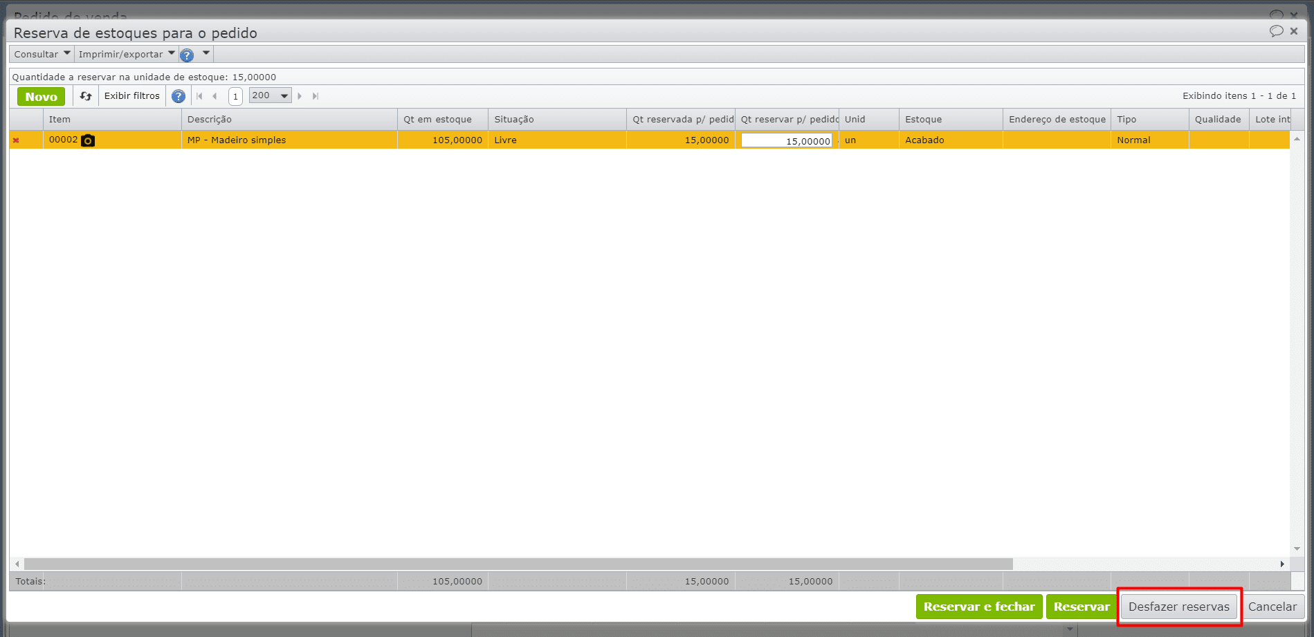 Por este motivo, recomenda-se verificar cuidadosamente a reserva, antes de desfazê-la, para evitar possíveis erros ou consequências indesejadas. Certifique-se de revisar todas as informações relevantes, como pedidos de venda, notas fiscais ou outros documentos associados à reserva, antes de executar o processo.