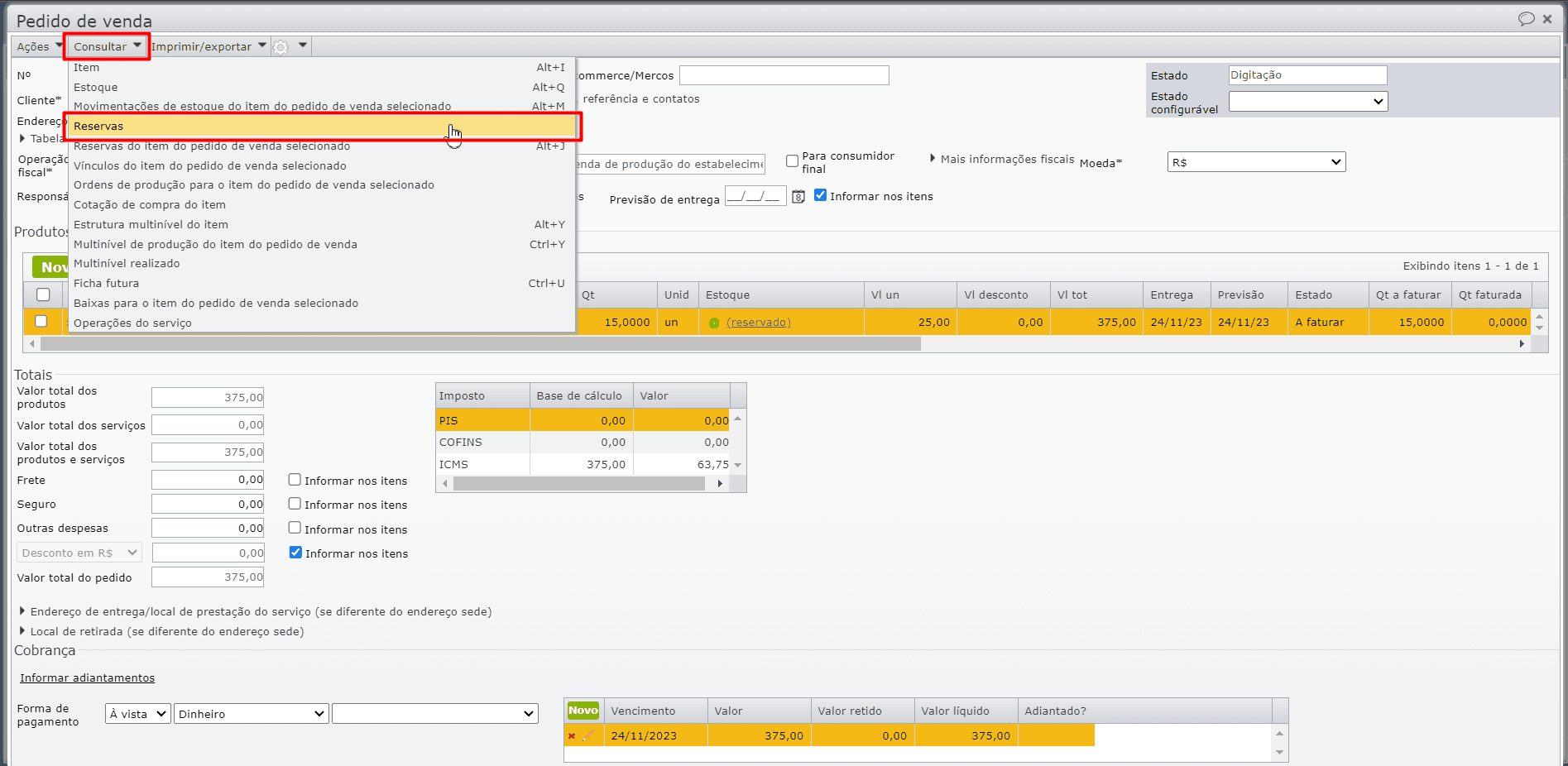 3) Por outro lado, é possível desfazer as reservas dos itens na edição do pedido/nota acessando o menu “Consultar” > “Reservas”.