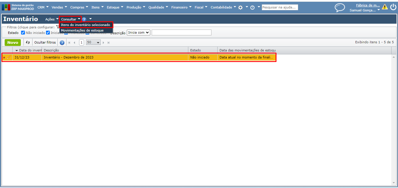 2) A seguir, selecione o inventário desejado e acesse o submenu “Consultar > Itens do inventário selecionado”.