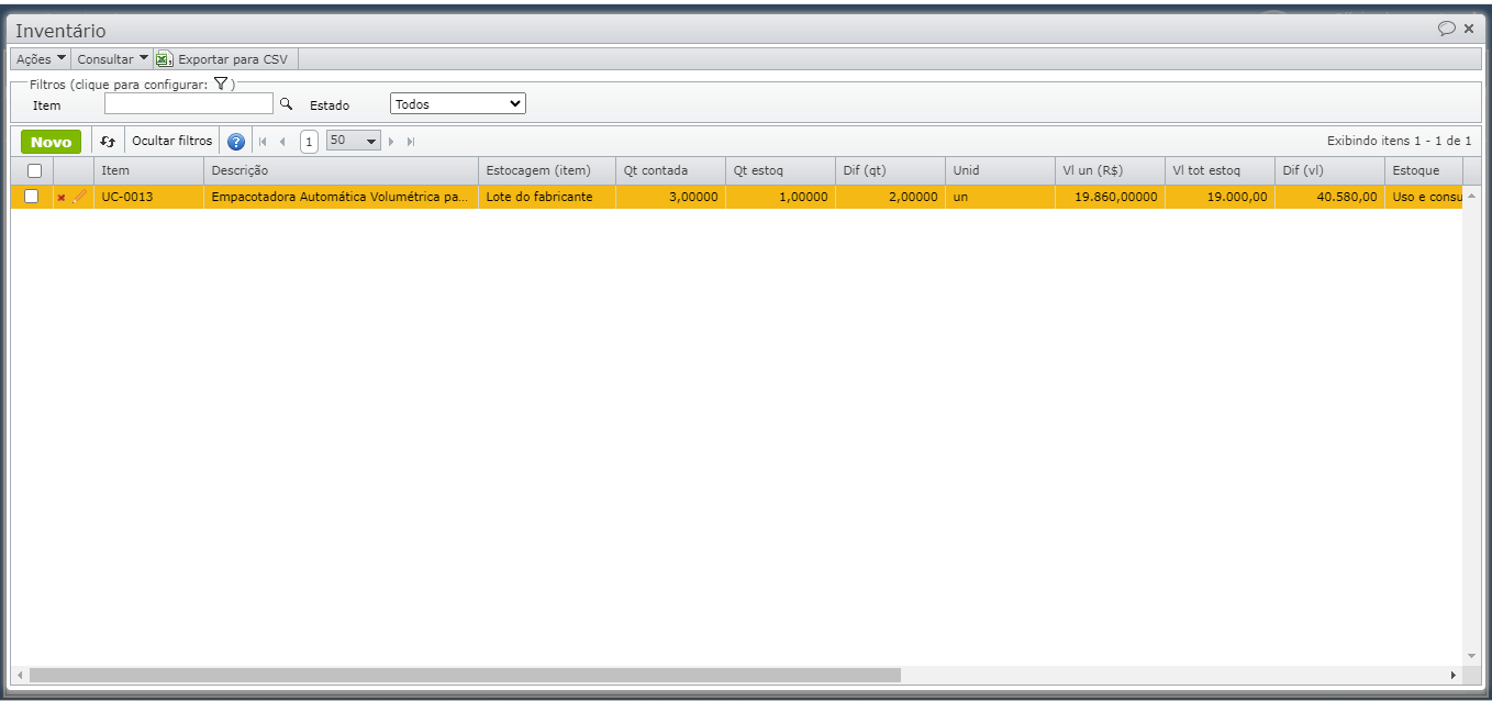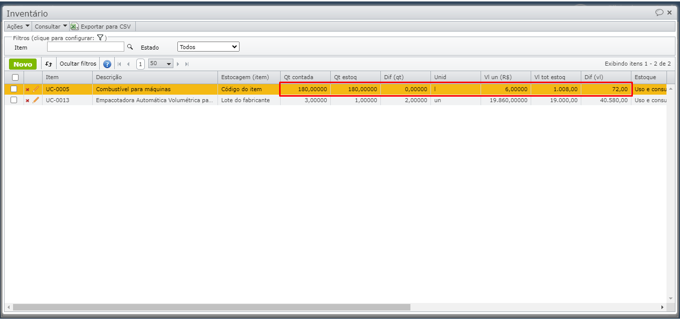 - Dif (vl): mostra a diferença entre o valor total atual do registro de estoque e o valor total resultante da quantidade contada, multiplicada pelo valor unitário preenchido pelo digitador.